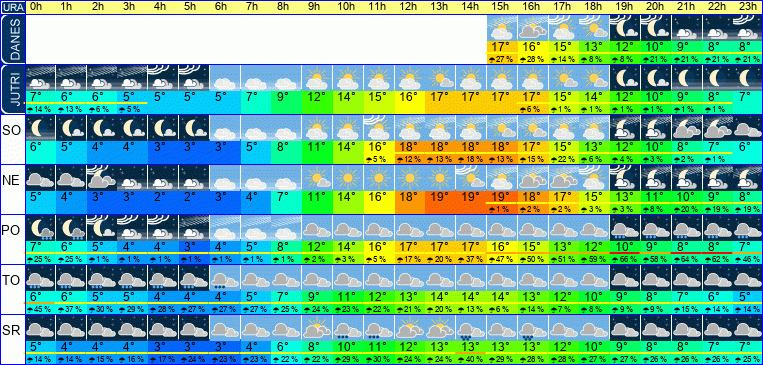 | Ura | 00h | 01h | 02h | 03h | 04h | 05h | 06h | 07h | 08h | 09h | 10h | 11h | 12h | 13h | 14h | 15h | 16h | 17h | 18h | 19h | 20h | 21h | 22h | 23h | |  |  |  |  |  |  |  |  |  |  |  |  |  |  |  |  |  |  |  |  |  |  |  |  | | Temperatura [C°] | 7°C | 6°C | 5°C | 4°C | 4°C | 3°C | 4°C | 5°C | 8°C | 12°C | 14°C | 16°C | 17°C | 17°C | 17°C | 16°C | 14°C | 13°C | 11°C | 10°C | 9°C | 8°C | 7°C | 7°C | | Občutek [C°] | 5°C | 4°C | 3°C | 2°C | 1°C | 1°C | 1°C | 3°C | 7°C | 10°C | 13°C | 15°C | 16°C | 16°C | 15°C | 14°C | 13°C | 11°C | 9°C | 8°C | 7°C | 6°C | 6°C | 5°C | | Možnost padavin | 25 % | 25 % | 1 % | 1 % | 1 % | 1 % | 1 % | 1 % | 1 % | 2 % | 3 % | 5 % | 17 % | 21 % | 37 % | 48 % | 50 % | 51 % | 59 % | 66 % | 58 % | 64 % | 62 % | 47 % | | Količina padavin [mm] | | | | | | | | | | | | | | | | | | | | | 1 mm | 2 mm | 2 mm | 2 mm | Sneg [cm] | | | | | | | | | | | | | | | | | | | | | | | | | | UV index | | | | | | | | | | | UV 1 | UV 2 | UV 2 | UV 2 | UV 1 | UV 2 | UV 1 | | | | | | | | | Hitrost vetra | 3 km/h | 3 km/h | 3 km/h | 3 km/h | 3 km/h | 3 km/h | 3 km/h | 3 km/h | 3 km/h | 2 km/h | 3 km/h | 3 km/h | 3 km/h | 4 km/h | 4 km/h | 5 km/h | 5 km/h | 6 km/h | 6 km/h | 5 km/h | 5 km/h | 4 km/h | 4 km/h | 4 km/h | Smer vetra | Z | Z | Z | Z | Z | Z | Z | Z | J | Z | S | S | S | S | S | V | V | V | V | V | V | S | S | S | | Zračni tlak | 1014 | 1014 | 1014 | 1013 | 1013 | 1013 | 1014 | 1014 | 1014 | 1014 | 1014 | 1014 | 1013 | 1013 | 1013 | 1013 | 1013 | 1014 | 1014 | 1015 | 1016 | 1016 | 1017 | 1017 | | Vlaga | 85 % | 87 % | 88 % | 91 % | 92 % | 93 % | 90 % | 87 % | 80 % | 68 % | 59 % | 53 % | 50 % | 49 % | 51 % | 55 % | 61 % | 66 % | 71 % | 75 % | 80 % | 84 % | 86 % | 87 % |