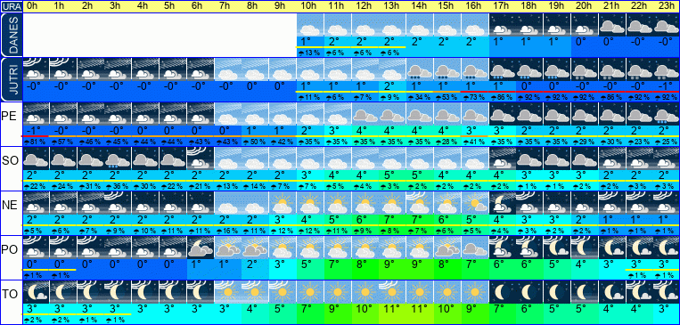 | Ura | 00h | 01h | 02h | 03h | 04h | 05h | 06h | 07h | 08h | 09h | 10h | 11h | 12h | 13h | 14h | 15h | 16h | 17h | 18h | 19h | 20h | 21h | 22h | 23h | |  |  |  |  |  |  |  |  |  |  |  |  |  |  |  |  |  |  |  |  |  |  |  |  | | Temperatura [C°] | -1°C | -0°C | -0°C | -0°C | 0°C | 0°C | 0°C | 0°C | 1°C | 1°C | 2°C | 3°C | 4°C | 4°C | 4°C | 4°C | 3°C | 3°C | 2°C | 2°C | 2°C | 2°C | 2°C | 2°C | | Občutek [C°] | -3°C | -3°C | -3°C | -3°C | -2°C | -2°C | -2°C | -2°C | -2°C | -1°C | -0°C | 1°C | 2°C | 2°C | 2°C | 1°C | 1°C | 0°C | -0°C | -1°C | -1°C | -1°C | -1°C | -1°C | | Možnost padavin | 81 % | 57 % | 46 % | 45 % | 44 % | 44 % | 43 % | 43 % | 50 % | 42 % | 35 % | 35 % | 35 % | 35 % | 35 % | 28 % | 41 % | 35 % | 35 % | 35 % | 29 % | 30 % | 23 % | 25 % | | Količina padavin [mm] | | | | | | | | | | | | | | | | | | | | | | | | | Sneg [cm] | | | | | | | | | | | | | | | | | | | | | | | | | | UV index | | | | | | | | | | | | | | | | | | | | | | | | | | Hitrost vetra | 2 km/h | 2 km/h | 2 km/h | 2 km/h | 2 km/h | 2 km/h | 2 km/h | 2 km/h | 2 km/h | 2 km/h | 2 km/h | 2 km/h | 2 km/h | 3 km/h | 3 km/h | 3 km/h | 3 km/h | 3 km/h | 3 km/h | 3 km/h | 4 km/h | 4 km/h | 4 km/h | 4 km/h | Smer vetra | Z | S | Z | V | Z | S | S | S | S | S | J | Z | S | S | S | S | S | S | S | S | S | S | S | S | | Zračni tlak | 1009 | 1009 | 1009 | 1009 | 1009 | 1009 | 1010 | 1010 | 1010 | 1011 | 1011 | 1011 | 1012 | 1012 | 1012 | 1012 | 1013 | 1013 | 1014 | 1014 | 1015 | 1015 | 1015 | 1015 | | Vlaga | 100 % | 100 % | 100 % | 100 % | 100 % | 100 % | 100 % | 100 % | 100 % | 100 % | 100 % | 97 % | 94 % | 93 % | 93 % | 96 % | 99 % | 100 % | 100 % | 100 % | 100 % | 100 % | 100 % | 100 % |