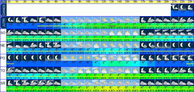 | Ura | 00h | 01h | 02h | 03h | 04h | 05h | 06h | 07h | 08h | 09h | 10h | 11h | 12h | 13h | 14h | 15h | 16h | 17h | 18h | 19h | 20h | 21h | 22h | 23h | |  |  |  |  |  |  |  |  |  |  |  |  |  |  |  |  |  |  |  |  |  |  |  |  | | Temperatura [C°] | -5°C | -5°C | -6°C | -6°C | -6°C | -7°C | -7°C | -7°C | -6°C | -5°C | -4°C | -3°C | -2°C | -2°C | -2°C | -3°C | -4°C | -5°C | -6°C | -7°C | -8°C | -9°C | -9°C | -10°C | | Občutek [C°] | -8°C | -9°C | -9°C | -10°C | -10°C | -10°C | -11°C | -11°C | -10°C | -9°C | -8°C | -7°C | -6°C | -6°C | -6°C | -7°C | -8°C | -9°C | -10°C | -11°C | -12°C | -12°C | -13°C | -14°C | | Možnost padavin | 4 % | 4 % | 3 % | 3 % | 2 % | 2 % | 3 % | 3 % | 3 % | 4 % | 4 % | 25 % | 5 % | 5 % | 25 % | 25 % | 25 % | 25 % | 25 % | 11 % | 11 % | 12 % | 12 % | 5 % | | Količina padavin [mm] | | | | | | | | | | | | | | | | | | | | | | | | | Sneg [cm] | | | | | | | | | | | | 0 cm | | | 0 cm | 0 cm | 0 cm | 0 cm | 0 cm | | | | | | | UV index | | | | | | | | | | | | UV 1 | UV 1 | UV 1 | UV 1 | UV 1 | | | | | | | | | | Hitrost vetra | 3 km/h | 3 km/h | 3 km/h | 3 km/h | 3 km/h | 3 km/h | 3 km/h | 4 km/h | 3 km/h | 4 km/h | 4 km/h | 5 km/h | 5 km/h | 5 km/h | 5 km/h | 4 km/h | 4 km/h | 3 km/h | 3 km/h | 3 km/h | 4 km/h | 3 km/h | 3 km/h | 3 km/h | Smer vetra | Z | Z | S | S | S | S | S | S | S | V | V | V | V | S | V | V | V | V | V | V | V | V | J | J | | Zračni tlak | 1010 | 1010 | 1011 | 1012 | 1012 | 1013 | 1014 | 1015 | 1016 | 1018 | 1019 | 1019 | 1020 | 1020 | 1021 | 1022 | 1022 | 1023 | 1024 | 1025 | 1026 | 1026 | 1027 | 1027 | | Vlaga | 99 % | 98 % | 97 % | 95 % | 93 % | 93 % | 93 % | 90 % | 87 % | 85 % | 80 % | 77 % | 73 % | 71 % | 71 % | 75 % | 79 % | 81 % | 82 % | 85 % | 85 % | 87 % | 88 % | 89 % |