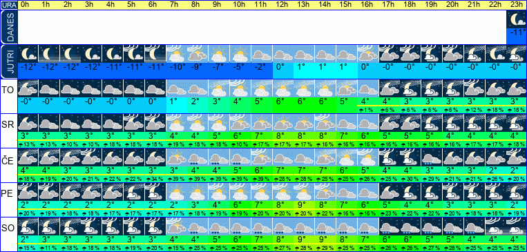 | Ura | 08h | 09h | 10h | 11h | 12h | 13h | 14h | 15h | 16h | 17h | 18h | 19h | 20h | 21h | 22h | 23h | | | | | | | | | |  |  |  |  |  |  |  |  |  |  |  |  |  |  |  |  | | Temperatura [C°] | -5°C | -4°C | -4°C | -3°C | -2°C | -2°C | -2°C | -3°C | -4°C | -6°C | -7°C | -8°C | -9°C | -10°C | -11°C | -11°C | | Občutek [C°] | -8°C | -8°C | -7°C | -6°C | -6°C | -5°C | -6°C | -7°C | -8°C | -10°C | -11°C | -13°C | -13°C | -14°C | -15°C | -15°C | | Možnost padavin | | | | | | | | | | | | | | | | | | Količina padavin [mm] | | | | | | | | | | | | | | | | | Sneg [cm] | | | | | | | | | | | | | | | | | | UV index | | | | UV 1 | UV 1 | UV 1 | UV 1 | UV 1 | | | | | | | | | | Hitrost vetra | 3 km/h | 2 km/h | 2 km/h | 2 km/h | 3 km/h | 3 km/h | 3 km/h | 3 km/h | 3 km/h | 3 km/h | 3 km/h | 3 km/h | 3 km/h | 3 km/h | 3 km/h | 4 km/h | Smer vetra | J | J | J | J | J | Z | Z | S | Z | Z | Z | J | J | J | J | J | | Zračni tlak | 1021 | 1021 | 1022 | 1022 | 1022 | 1022 | 1022 | 1023 | 1023 | 1024 | 1025 | 1026 | 1026 | 1026 | 1026 | 1026 | | Vlaga | 83 % | 84 % | 80 % | 75 % | 70 % | 67 % | 67 % | 70 % | 76 % | 76 % | 75 % | 77 % | 78 % | 81 % | 85 % | 86 % |
