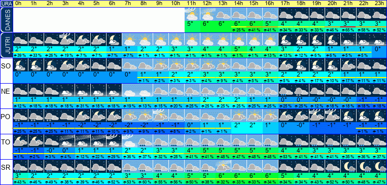 | Ura | 10h | 11h | 12h | 13h | 14h | 15h | 16h | 17h | 18h | 19h | 20h | 21h | 22h | 23h | | | | | | | | | | | |  |  |  |  |  |  |  |  |  |  |  |  |  |  | | Temperatura [C°] | 5°C | 6°C | 7°C | 7°C | 7°C | 7°C | 6°C | 5°C | 4°C | 4°C | 4°C | 3°C | 3°C | 3°C | | Občutek [C°] | 3°C | 4°C | 5°C | 5°C | 5°C | 5°C | 4°C | 3°C | 2°C | 2°C | 1°C | 1°C | 0°C | -0°C | | Možnost padavin | 5 % | | | 1 % | 25 % | 38 % | 52 % | 52 % | 46 % | 40 % | 60 % | 53 % | 60 % | 53 % | | Količina padavin [mm] | | | | | | | | | | | | | | | Sneg [cm] | | | | | | | | | | | | | | | | UV index | | | | UV 1 | UV 1 | | | | | | | | | | | Hitrost vetra | 2 km/h | 3 km/h | 3 km/h | 4 km/h | 4 km/h | 4 km/h | 3 km/h | 3 km/h | 3 km/h | 3 km/h | 4 km/h | 4 km/h | 4 km/h | 4 km/h | Smer vetra | S | S | S | S | S | S | S | S | S | S | V | J | J | J | | Zračni tlak | 995 | 995 | 995 | 995 | 996 | 996 | 997 | 998 | 998 | 999 | 1000 | 1001 | 1001 | 1002 | | Vlaga | 93 % | 88 % | 82 % | 81 % | 82 % | 86 % | 90 % | 93 % | 94 % | 94 % | 94 % | 94 % | 94 % | 95 % |