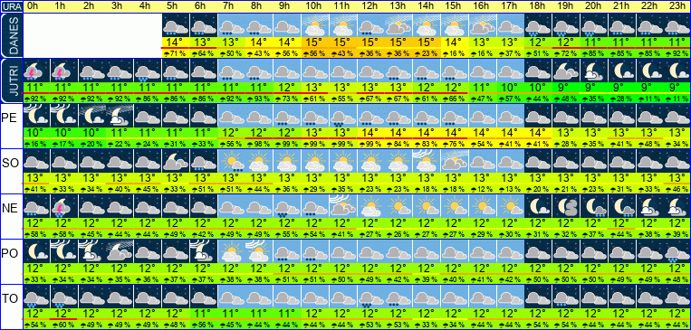 | Ura | 00h | 01h | 02h | 03h | 04h | 05h | 06h | 07h | 08h | 09h | 10h | 11h | 12h | 13h | 14h | 15h | 16h | 17h | 18h | 19h | 20h | 21h | 22h | 23h | |  |  |  |  |  |  |  |  |  |  |  |  |  |  |  |  |  |  |  |  |  |  |  |  | | Temperatura [C°] | 12°C | 12°C | 12°C | 12°C | 12°C | 12°C | 12°C | 12°C | 12°C | 12°C | 12°C | 12°C | 12°C | 13°C | 12°C | 12°C | 12°C | 12°C | 12°C | 12°C | 12°C | 12°C | 12°C | 12°C | | Občutek [C°] | 9°C | 9°C | 9°C | 10°C | 10°C | 10°C | 10°C | 10°C | 11°C | 11°C | 11°C | 11°C | 12°C | 12°C | 12°C | 12°C | 12°C | 12°C | 11°C | 11°C | 12°C | 11°C | 11°C | 11°C | | Možnost padavin | 54 % | 53 % | 46 % | 46 % | 45 % | 44 % | 36 % | 43 % | 42 % | 47 % | 46 % | 40 % | 30 % | 31 % | 32 % | 31 % | 37 % | 38 % | 39 % | 40 % | 42 % | 49 % | 41 % | 42 % | | Količina padavin [mm] | 1 mm | 3 mm | | | | | | | | 3 mm | 2 mm | | | | | | | | | | 4 mm | 2 mm | | | Sneg [cm] | | | | | | | | | | | | | | | | | | | | | | | | | | UV index | | | | | | | | | | | | UV 1 | UV 1 | UV 1 | UV 1 | UV 1 | | | | | | | | | | Hitrost vetra | 15 km/h | 14 km/h | 14 km/h | 12 km/h | 11 km/h | 11 km/h | 9 km/h | 9 km/h | 6 km/h | 6 km/h | 4 km/h | 3 km/h | 3 km/h | 2 km/h | 2 km/h | 2 km/h | 3 km/h | 3 km/h | 4 km/h | 4 km/h | 2 km/h | 3 km/h | 4 km/h | 5 km/h | Smer vetra | V | V | V | V | V | V | V | V | V | V | V | V | J | J | J | V | V | V | V | V | V | V | V | V | | Zračni tlak | 1007 | 1006 | 1006 | 1006 | 1006 | 1006 | 1006 | 1006 | 1007 | 1007 | 1008 | 1008 | 1008 | 1008 | 1008 | 1008 | 1008 | 1009 | 1009 | 1009 | 1010 | 1010 | 1010 | 1010 | | Vlaga | 83 % | 85 % | 84 % | 83 % | 83 % | 83 % | 81 % | 81 % | 81 % | 81 % | 80 % | 79 % | 77 % | 76 % | 78 % | 78 % | 79 % | 80 % | 81 % | 83 % | 84 % | 84 % | 85 % | 85 % |