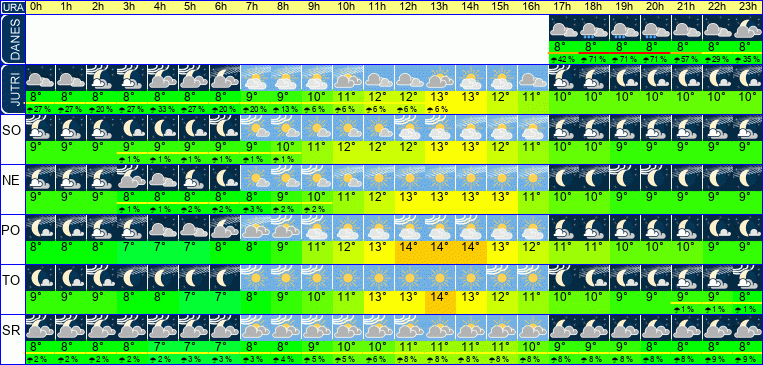 | Ura | 00h | 01h | 02h | 03h | 04h | 05h | 06h | 07h | 08h | 09h | 10h | 11h | 12h | 13h | 14h | 15h | 16h | 17h | 18h | 19h | 20h | 21h | 22h | 23h | |  |  |  |  |  |  |  |  |  |  |  |  |  |  |  |  |  |  |  |  |  |  |  |  | | Temperatura [C°] | 9°C | 8°C | 8°C | 8°C | 8°C | 8°C | 8°C | 9°C | 9°C | 10°C | 11°C | 12°C | 12°C | 13°C | 13°C | 12°C | 11°C | 10°C | 10°C | 10°C | 10°C | 10°C | 10°C | 10°C | | Občutek [C°] | 5°C | 5°C | 5°C | 5°C | 5°C | 5°C | 5°C | 6°C | 6°C | 8°C | 8°C | 9°C | 10°C | 10°C | 9°C | 9°C | 7°C | 6°C | 6°C | 5°C | 5°C | 5°C | 5°C | 5°C | | Možnost padavin | 28 % | 27 % | 20 % | 27 % | 34 % | 27 % | 20 % | 20 % | 13 % | 6 % | 6 % | 6 % | 6 % | 6 % | | | | | | | | | | | | Količina padavin [mm] | | | | | | | | | | | | | | | | | | | | | | | | | Sneg [cm] | | | | | | | | | | | | | | | | | | | | | | | | | | UV index | | | | | | | | | | | | | UV 1 | UV 1 | UV 1 | | | | | | | | | | | Hitrost vetra | 12 km/h | 11 km/h | 10 km/h | 9 km/h | 9 km/h | 9 km/h | 9 km/h | 9 km/h | 9 km/h | 8 km/h | 8 km/h | 7 km/h | 8 km/h | 9 km/h | 10 km/h | 11 km/h | 12 km/h | 13 km/h | 15 km/h | 16 km/h | 16 km/h | 17 km/h | 17 km/h | 17 km/h | Smer vetra | V | V | V | V | V | V | V | V | V | V | S | S | S | V | V | V | V | V | V | V | V | V | V | V | | Zračni tlak | 1006 | 1006 | 1006 | 1007 | 1007 | 1007 | 1007 | 1008 | 1008 | 1008 | 1009 | 1009 | 1009 | 1009 | 1009 | 1010 | 1010 | 1010 | 1011 | 1011 | 1012 | 1012 | 1012 | 1013 | | Vlaga | 68 % | 68 % | 69 % | 71 % | 73 % | 75 % | 76 % | 75 % | 73 % | 70 % | 67 % | 65 % | 63 % | 60 % | 59 % | 61 % | 63 % | 65 % | 65 % | 66 % | 66 % | 66 % | 65 % | 65 % |