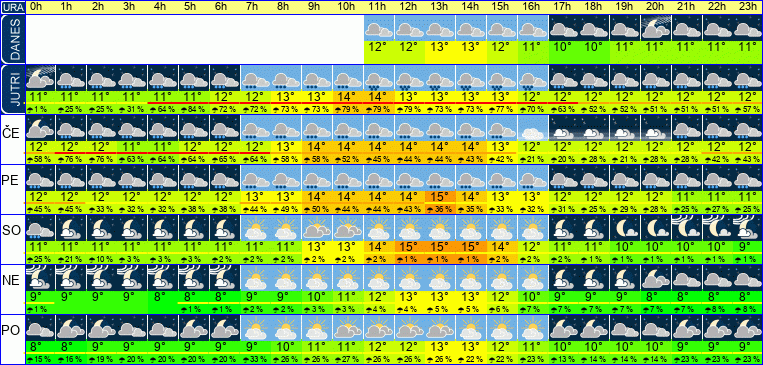 | Ura | 00h | 01h | 02h | 03h | 04h | 05h | 06h | 07h | 08h | 09h | 10h | 11h | 12h | 13h | 14h | 15h | 16h | 17h | 18h | 19h | 20h | 21h | 22h | 23h | |  |  |  |  |  |  |  |  |  |  |  |  |  |  |  |  |  |  |  |  |  |  |  |  | | Temperatura [C°] | 11°C | 12°C | 12°C | 12°C | 12°C | 12°C | 12°C | 12°C | 13°C | 14°C | 14°C | 14°C | 14°C | 14°C | 13°C | 13°C | 12°C | 12°C | 12°C | 12°C | 12°C | 12°C | 12°C | 12°C | | Občutek [C°] | 9°C | 9°C | 9°C | 9°C | 9°C | 10°C | 10°C | 10°C | 11°C | 12°C | 12°C | 12°C | 12°C | 12°C | 12°C | 11°C | 10°C | 10°C | 10°C | 10°C | 10°C | 10°C | 10°C | 10°C | | Možnost padavin | 15 % | 25 % | 29 % | 56 % | 64 % | 65 % | 72 % | 85 % | 85 % | 85 % | 92 % | 73 % | 79 % | 73 % | 72 % | 67 % | 59 % | 65 % | 65 % | 64 % | 76 % | 76 % | 63 % | 69 % | | Količina padavin [mm] | | | | 1 mm | 1 mm | 1 mm | 1 mm | 2 mm | 2 mm | 2 mm | 2 mm | 3 mm | 3 mm | 3 mm | 3 mm | 3 mm | 3 mm | 2 mm | 2 mm | 1 mm | 1 mm | 1 mm | 1 mm | 1 mm | Sneg [cm] | | | | | | | | | | | | | | | | | | | | | | | | | | UV index | | | | | | | | | | | | | | | | | | | | | | | | | | Hitrost vetra | 8 km/h | 8 km/h | 8 km/h | 7 km/h | 7 km/h | 8 km/h | 8 km/h | 8 km/h | 7 km/h | 7 km/h | 7 km/h | 7 km/h | 8 km/h | 8 km/h | 8 km/h | 9 km/h | 9 km/h | 8 km/h | 9 km/h | 9 km/h | 10 km/h | 10 km/h | 9 km/h | 9 km/h | Smer vetra | V | V | V | V | S | V | V | V | S | J | V | J | J | J | V | J | V | V | V | V | V | V | J | J | | Zračni tlak | 1021 | 1021 | 1021 | 1021 | 1020 | 1020 | 1021 | 1021 | 1021 | 1022 | 1023 | 1023 | 1022 | 1022 | 1023 | 1023 | 1023 | 1023 | 1024 | 1024 | 1024 | 1025 | 1025 | 1026 | | Vlaga | 63 % | 65 % | 68 % | 71 % | 74 % | 75 % | 76 % | 76 % | 75 % | 72 % | 72 % | 72 % | 73 % | 72 % | 72 % | 74 % | 78 % | 80 % | 80 % | 80 % | 81 % | 81 % | 82 % | 83 % |