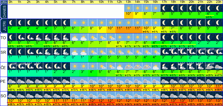 | Ura | 00h | 01h | 02h | 03h | 04h | 05h | 06h | 07h | 08h | 09h | 10h | 11h | 12h | 13h | 14h | 15h | 16h | 17h | 18h | 19h | 20h | 21h | 22h | 23h | |  |  |  |  |  |  |  |  |  |  |  |  |  |  |  |  |  |  |  |  |  |  |  |  | | Temperatura [C°] | 10°C | 10°C | 10°C | 10°C | 10°C | 10°C | 10°C | 11°C | 11°C | 12°C | 12°C | 12°C | 12°C | 13°C | 13°C | 12°C | 12°C | 12°C | 12°C | 12°C | 12°C | 12°C | 12°C | 12°C | | Občutek [C°] | 4°C | 4°C | 3°C | 3°C | 3°C | 3°C | 3°C | 4°C | 4°C | 5°C | 6°C | 6°C | 6°C | 6°C | 6°C | 5°C | 4°C | 4°C | 5°C | 5°C | 5°C | 5°C | 5°C | 5°C | | Možnost padavin | 88 % | 76 % | 80 % | 73 % | 65 % | 71 % | 62 % | 61 % | 69 % | 69 % | 61 % | 61 % | 54 % | 54 % | 44 % | 44 % | 44 % | 43 % | 61 % | 60 % | 50 % | 50 % | 49 % | 49 % | | Količina padavin [mm] | 1 mm | 1 mm | 1 mm | 1 mm | 1 mm | 2 mm | 2 mm | 3 mm | 3 mm | 3 mm | 2 mm | 2 mm | 1 mm | | | | 1 mm | 1 mm | 1 mm | 1 mm | 1 mm | 1 mm | 1 mm | 1 mm | Sneg [cm] | | | | | | | | | | | | | | | | | | | | | | | | | | UV index | | | | | | | | | | | | UV 1 | UV 1 | UV 1 | UV 1 | | | | | | | | | | | Hitrost vetra | 27 km/h | 28 km/h | 31 km/h | 31 km/h | 30 km/h | 30 km/h | 30 km/h | 30 km/h | 29 km/h | 27 km/h | 26 km/h | 25 km/h | 26 km/h | 27 km/h | 34 km/h | 36 km/h | 37 km/h | 36 km/h | 34 km/h | 33 km/h | 33 km/h | 33 km/h | 32 km/h | 31 km/h | Smer vetra | J | J | J | J | J | J | J | J | J | J | J | J | J | J | J | J | J | J | J | J | J | J | J | J | | Zračni tlak | 1007 | 1006 | 1006 | 1006 | 1006 | 1006 | 1006 | 1006 | 1006 | 1006 | 1007 | 1006 | 1006 | 1005 | 1005 | 1005 | 1005 | 1004 | 1004 | 1004 | 1004 | 1004 | 1004 | 1004 | | Vlaga | 73 % | 73 % | 77 % | 76 % | 74 % | 71 % | 69 % | 65 % | 63 % | 59 % | 57 % | 58 % | 56 % | 54 % | 74 % | 73 % | 74 % | 74 % | 74 % | 74 % | 74 % | 74 % | 75 % | 76 % |
