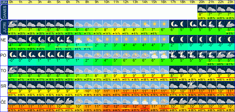 | Ura | 00h | 01h | 02h | 03h | 04h | 05h | 06h | 07h | 08h | 09h | 10h | 11h | 12h | 13h | 14h | 15h | 16h | 17h | 18h | 19h | 20h | 21h | 22h | 23h | |  |  |  |  |  |  |  |  |  |  |  |  |  |  |  |  |  |  |  |  |  |  |  |  | | Temperatura [C°] | 7°C | 6°C | 6°C | 6°C | 6°C | 5°C | 5°C | 6°C | 6°C | 7°C | 7°C | 8°C | 9°C | 9°C | 8°C | 8°C | 7°C | 6°C | 6°C | 5°C | 5°C | 5°C | 5°C | 4°C | | Občutek [C°] | 4°C | 4°C | 3°C | 3°C | 3°C | 2°C | 2°C | 2°C | 2°C | 2°C | 3°C | 4°C | 5°C | 5°C | 5°C | 4°C | 4°C | 3°C | 2°C | 1°C | 1°C | 1°C | 1°C | 0°C | | Možnost padavin | 31 % | 24 % | 30 % | 32 % | 36 % | 30 % | 29 % | 17 % | 22 % | 10 % | 16 % | 10 % | 10 % | 4 % | 3 % | 2 % | 1 % | 1 % | 1 % | 1 % | 1 % | | | | | Količina padavin [mm] | | | | | | | | | | | | | | | | | | | | | | | | | Sneg [cm] | | | | | | | | | | | | | | | | | | | | | | | | | | UV index | | | | | | | | | | | | | UV 1 | UV 1 | UV 1 | | | | | | | | | | | Hitrost vetra | 7 km/h | 6 km/h | 7 km/h | 7 km/h | 7 km/h | 8 km/h | 10 km/h | 11 km/h | 12 km/h | 13 km/h | 12 km/h | 11 km/h | 10 km/h | 9 km/h | 9 km/h | 7 km/h | 7 km/h | 7 km/h | 8 km/h | 9 km/h | 9 km/h | 9 km/h | 10 km/h | 10 km/h | Smer vetra | V | V | V | S | V | V | V | V | V | V | V | V | V | V | V | S | S | S | V | V | V | V | V | V | | Zračni tlak | 1001 | 1001 | 1001 | 1001 | 1001 | 1000 | 1000 | 1000 | 1000 | 1000 | 1001 | 1001 | 1001 | 1001 | 1001 | 1002 | 1002 | 1003 | 1004 | 1004 | 1005 | 1005 | 1006 | 1007 | | Vlaga | 77 % | 77 % | 76 % | 76 % | 77 % | 76 % | 75 % | 72 % | 68 % | 64 % | 60 % | 57 % | 54 % | 53 % | 54 % | 56 % | 59 % | 62 % | 64 % | 64 % | 64 % | 64 % | 63 % | 63 % |
