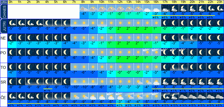 | Ura | 00h | 01h | 02h | 03h | 04h | 05h | 06h | 07h | 08h | 09h | 10h | 11h | 12h | 13h | 14h | 15h | 16h | 17h | 18h | 19h | 20h | 21h | 22h | 23h | |  |  |  |  |  |  |  |  |  |  |  |  |  |  |  |  |  |  |  |  |  |  |  |  | | Temperatura [C°] | -4°C | -5°C | -5°C | -5°C | -6°C | -6°C | -6°C | -7°C | -6°C | -5°C | -4°C | -2°C | -0°C | -0°C | -0°C | -2°C | -3°C | -4°C | -5°C | -6°C | -7°C | -7°C | -7°C | -8°C | | Občutek [C°] | -9°C | -9°C | -10°C | -10°C | -10°C | -11°C | -11°C | -11°C | -11°C | -9°C | -7°C | -5°C | -4°C | -4°C | -4°C | -5°C | -7°C | -8°C | -9°C | -10°C | -10°C | -11°C | -11°C | -12°C | | Možnost padavin | | | | | | | | | | | | | | | | | | | | | | | | | | Količina padavin [mm] | | | | | | | | | | | | | | | | | | | | | | | | | Sneg [cm] | | | | | | | | | | | | | | | | | | | | | | | | | | UV index | | | | | | | | | | | | UV 1 | UV 1 | UV 1 | UV 1 | | | | | | | | | | | Hitrost vetra | 7 km/h | 7 km/h | 7 km/h | 7 km/h | 7 km/h | 7 km/h | 7 km/h | 6 km/h | 5 km/h | 3 km/h | 1 km/h | 1 km/h | 2 km/h | 3 km/h | 4 km/h | 4 km/h | 4 km/h | 4 km/h | 3 km/h | 3 km/h | 3 km/h | 3 km/h | 3 km/h | 3 km/h | Smer vetra | Z | Z | Z | Z | Z | Z | Z | Z | Z | Z | J | V | V | V | V | V | V | V | V | J | J | J | J | J | | Zračni tlak | 1017 | 1016 | 1016 | 1016 | 1016 | 1016 | 1016 | 1016 | 1016 | 1017 | 1017 | 1017 | 1017 | 1016 | 1017 | 1017 | 1017 | 1018 | 1018 | 1019 | 1019 | 1019 | 1020 | 1020 | | Vlaga | 70 % | 71 % | 74 % | 75 % | 77 % | 76 % | 77 % | 76 % | 75 % | 74 % | 74 % | 68 % | 62 % | 59 % | 60 % | 68 % | 75 % | 78 % | 80 % | 82 % | 76 % | 76 % | 77 % | 78 % |