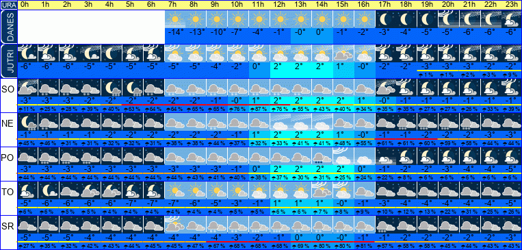 | Ura | 03h | 04h | 05h | 06h | 07h | 08h | 09h | 10h | 11h | 12h | 13h | 14h | 15h | 16h | 17h | 18h | 19h | 20h | 21h | 22h | 23h | | | | |  |  |  |  |  |  |  |  |  |  |  |  |  |  |  |  |  |  |  |  |  | | Temperatura [C°] | -11°C | -11°C | -11°C | -11°C | -11°C | -10°C | -8°C | -5°C | -1°C | 1°C | 2°C | 2°C | 1°C | -1°C | -3°C | -4°C | -5°C | -5°C | -6°C | -6°C | -6°C | | Občutek [C°] | -16°C | -16°C | -16°C | -16°C | -16°C | -15°C | -12°C | -9°C | -5°C | -3°C | -2°C | -2°C | -2°C | -5°C | -6°C | -7°C | -8°C | -9°C | -9°C | -9°C | -10°C | | Možnost padavin | 5 % | 5 % | 5 % | 5 % | | | | | | | | | | | | | | | | | | | Količina padavin [mm] | | | | | | | | | | | | | | | | | | | | | | Sneg [cm] | | | | | | | | | | | | | | | | | | | | | | | UV index | | | | | | | | | UV 1 | UV 1 | UV 1 | UV 1 | UV 1 | | | | | | | | | | Hitrost vetra | 6 km/h | 6 km/h | 7 km/h | 7 km/h | 7 km/h | 6 km/h | 5 km/h | 4 km/h | 4 km/h | 3 km/h | 2 km/h | 1 km/h | 0 km/h | 2 km/h | 2 km/h | 1 km/h | 1 km/h | 1 km/h | 1 km/h | 2 km/h | 3 km/h | Smer vetra | Z | Z | Z | Z | Z | Z | Z | Z | S | S | Z | Z | S | V | V | V | S | S | Z | Z | Z | | Zračni tlak | 1006 | 1005 | 1005 | 1005 | 1005 | 1004 | 1004 | 1003 | 1002 | 1002 | 1001 | 1001 | 1001 | 1001 | 1001 | 1002 | 1002 | 1003 | 1003 | 1003 | 1003 | | Vlaga | 66 % | 70 % | 71 % | 74 % | 74 % | 72 % | 68 % | 66 % | 57 % | 50 % | 50 % | 50 % | 57 % | 67 % | 68 % | 74 % | 80 % | 82 % | 85 % | 85 % | 85 % |