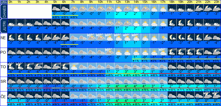 | Ura | 00h | | | | | | | | | | | | | | | | | | | | | | | | |  | | Temperatura [C°] | 1°C | | Občutek [C°] | -2°C | | Možnost padavin | 68 % | | Količina padavin [mm] | 3 mm | Sneg [cm] | | | UV index | | | Hitrost vetra | 6 km/h | Smer vetra | V | | Zračni tlak | 1002 | | Vlaga | 95 % |