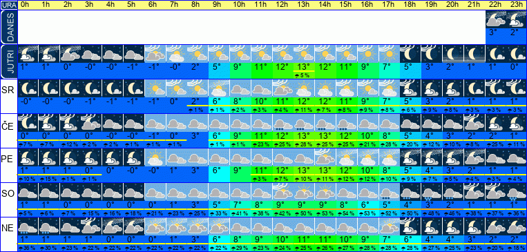 | Ura | 00h | 01h | 02h | 03h | 04h | 05h | 06h | 07h | 08h | 09h | 10h | 11h | 12h | 13h | 14h | 15h | 16h | 17h | 18h | 19h | 20h | 21h | 22h | 23h | |  |  |  |  |  |  |  |  |  |  |  |  |  |  |  |  |  |  |  |  |  |  |  |  | | Temperatura [C°] | 1°C | 0°C | 0°C | 0°C | 0°C | -0°C | -0°C | 1°C | 3°C | 5°C | 8°C | 9°C | 10°C | 11°C | 11°C | 11°C | 9°C | 8°C | 6°C | 5°C | 4°C | 3°C | 3°C | 2°C | | Občutek [C°] | -3°C | -3°C | -3°C | -3°C | -3°C | -4°C | -4°C | -3°C | -0°C | 3°C | 5°C | 7°C | 7°C | 8°C | 8°C | 8°C | 6°C | 5°C | 3°C | 2°C | 1°C | 0°C | -1°C | -1°C | | Možnost padavin | 29 % | 29 % | 24 % | 23 % | 22 % | 22 % | 22 % | 23 % | 23 % | 23 % | 23 % | 24 % | 25 % | 33 % | 36 % | 37 % | 47 % | 47 % | 48 % | 47 % | 45 % | 42 % | 30 % | 28 % | | Količina padavin [mm] | 1 mm | 1 mm | | | | | | | | | | | | | | | | | | 1 mm | 1 mm | | | | Sneg [cm] | | | | | | | | | | | | | | | | | | | | | | | | | | UV index | | | | | | | | | | | UV 1 | UV 1 | UV 2 | UV 2 | UV 2 | UV 2 | UV 1 | | | | | | | | | Hitrost vetra | 4 km/h | 5 km/h | 5 km/h | 5 km/h | 5 km/h | 5 km/h | 5 km/h | 4 km/h | 3 km/h | 1 km/h | 1 km/h | 2 km/h | 4 km/h | 4 km/h | 4 km/h | 3 km/h | 4 km/h | 3 km/h | 3 km/h | 4 km/h | 3 km/h | 4 km/h | 4 km/h | 4 km/h | Smer vetra | Z | Z | Z | Z | Z | Z | Z | Z | Z | Z | S | V | V | V | V | V | V | V | V | V | V | S | S | S | | Zračni tlak | 1013 | 1013 | 1013 | 1014 | 1014 | 1014 | 1014 | 1015 | 1015 | 1015 | 1015 | 1015 | 1015 | 1014 | 1014 | 1014 | 1014 | 1015 | 1016 | 1016 | 1017 | 1017 | 1018 | 1018 | | Vlaga | 85 % | 85 % | 82 % | 82 % | 81 % | 81 % | 81 % | 79 % | 83 % | 72 % | 60 % | 53 % | 47 % | 43 % | 42 % | 45 % | 48 % | 53 % | 61 % | 66 % | 68 % | 72 % | 75 % | 79 % |