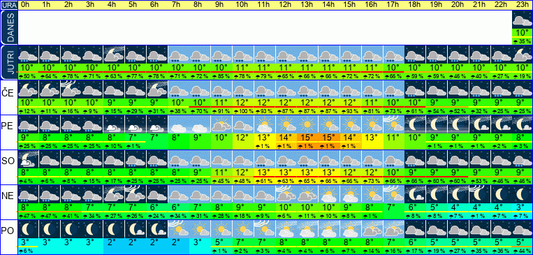 | Ura | 00h | 01h | 02h | 03h | 04h | 05h | 06h | 07h | 08h | 09h | 10h | 11h | 12h | 13h | 14h | 15h | 16h | 17h | 18h | 19h | 20h | 21h | 22h | 23h | |  |  |  |  |  |  |  |  |  |  |  |  |  |  |  |  |  |  |  |  |  |  |  |  | | Temperatura [C°] | 10°C | 10°C | 10°C | 10°C | 9°C | 9°C | 9°C | 10°C | 10°C | 11°C | 12°C | 12°C | 12°C | 12°C | 12°C | 12°C | 11°C | 10°C | 10°C | 9°C | 9°C | 9°C | 9°C | 9°C | | Občutek [C°] | 8°C | 8°C | 8°C | 8°C | 7°C | 7°C | 7°C | 7°C | 8°C | 8°C | 9°C | 9°C | 9°C | 9°C | 10°C | 10°C | 9°C | 9°C | 8°C | 8°C | 8°C | 8°C | 8°C | 8°C | | Možnost padavin | 12 % | 11 % | 16 % | 9 % | 15 % | 29 % | 31 % | 38 % | 70 % | 91 % | 100 % | 93 % | 87 % | 87 % | 87 % | 93 % | 81 % | 73 % | 61 % | 54 % | 52 % | 32 % | 25 % | 25 % | | Količina padavin [mm] | | | | | | | | | | 1 mm | 1 mm | 1 mm | 1 mm | 1 mm | 1 mm | 1 mm | | | | | | | | | Sneg [cm] | | | | | | | | | | | | | | | | | | | | | | | | | | UV index | | | | | | | | | | | | | | | | | | | | | | | | | | Hitrost vetra | 7 km/h | 7 km/h | 7 km/h | 8 km/h | 9 km/h | 10 km/h | 11 km/h | 13 km/h | 14 km/h | 15 km/h | 16 km/h | 16 km/h | 15 km/h | 14 km/h | 13 km/h | 11 km/h | 10 km/h | 9 km/h | 7 km/h | 6 km/h | 5 km/h | 5 km/h | 5 km/h | 5 km/h | Smer vetra | J | J | J | J | J | J | J | J | J | J | J | J | J | J | J | J | J | J | J | J | J | V | S | V | | Zračni tlak | 997 | 996 | 995 | 994 | 993 | 992 | 991 | 990 | 989 | 989 | 988 | 987 | 986 | 985 | 985 | 985 | 985 | 985 | 986 | 986 | 987 | 987 | 988 | 988 | | Vlaga | 99 % | 99 % | 99 % | 100 % | 100 % | 100 % | 100 % | 100 % | 100 % | 97 % | 95 % | 93 % | 93 % | 93 % | 94 % | 95 % | 97 % | 100 % | 100 % | 100 % | 100 % | 100 % | 99 % | 100 % |
