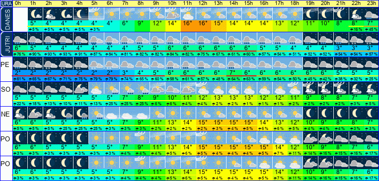 | Ura | 00h | 01h | 02h | 03h | 04h | 05h | 06h | 07h | 08h | 09h | 10h | 11h | 12h | 13h | 14h | 15h | 16h | 17h | 18h | 19h | 20h | 21h | 22h | 23h | |  |  |  |  |  |  |  |  |  |  |  |  |  |  |  |  |  |  |  |  |  |  |  |  | | Temperatura [C°] | 5°C | 5°C | 4°C | 4°C | 4°C | 4°C | 4°C | 6°C | 9°C | 12°C | 14°C | 16°C | 16°C | 15°C | 14°C | 14°C | 14°C | 13°C | 12°C | 11°C | 10°C | 8°C | 8°C | 7°C | | Občutek [C°] | 3°C | 2°C | 2°C | 1°C | 1°C | 1°C | 1°C | 3°C | 6°C | 9°C | 11°C | 12°C | 12°C | 11°C | 10°C | 9°C | 9°C | 9°C | 8°C | 7°C | 6°C | 5°C | 5°C | 4°C | | Možnost padavin | 5 % | 5 % | 5 % | 5 % | 5 % | 3 % | | | | | | | | | | | | | | | | | 16 % | 45 % | | Količina padavin [mm] | | | | | | | | | | | | | | | | | | | | | | | | | Sneg [cm] | | | | | | | | | | | | | | | | | | | | | | | | | | UV index | | | | | | | | | | UV 1 | UV 2 | UV 3 | UV 3 | UV 4 | UV 3 | UV 3 | UV 2 | UV 1 | | | | | | | | Hitrost vetra | 4 km/h | 4 km/h | 5 km/h | 5 km/h | 5 km/h | 5 km/h | 5 km/h | 5 km/h | 6 km/h | 6 km/h | 8 km/h | 11 km/h | 13 km/h | 14 km/h | 15 km/h | 16 km/h | 16 km/h | 15 km/h | 12 km/h | 10 km/h | 9 km/h | 7 km/h | 6 km/h | 6 km/h | Smer vetra | S | Z | S | S | Z | Z | Z | Z | Z | J | J | Z | Z | Z | Z | Z | Z | J | Z | Z | Z | Z | Z | S | | Zračni tlak | 1018 | 1017 | 1017 | 1016 | 1016 | 1015 | 1014 | 1014 | 1013 | 1012 | 1012 | 1010 | 1008 | 1007 | 1005 | 1004 | 1003 | 1003 | 1002 | 1002 | 1001 | 1001 | 1001 | 1001 | | Vlaga | 81 % | 81 % | 83 % | 84 % | 84 % | 82 % | 77 % | 70 % | 65 % | 56 % | 47 % | 38 % | 41 % | 40 % | 39 % | 41 % | 45 % | 46 % | 43 % | 42 % | 46 % | 57 % | 63 % | 68 % |