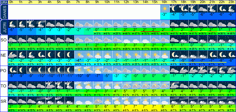 | Ura | 00h | 01h | 02h | 03h | 04h | 05h | 06h | 07h | 08h | 09h | 10h | 11h | 12h | 13h | 14h | 15h | 16h | 17h | 18h | 19h | 20h | 21h | 22h | 23h | |  |  |  |  |  |  |  |  |  |  |  |  |  |  |  |  |  |  |  |  |  |  |  |  | | Temperatura [C°] | -5°C | -4°C | -3°C | -2°C | -2°C | -2°C | -2°C | -1°C | -1°C | 0°C | 1°C | 2°C | 2°C | 2°C | 2°C | 2°C | 2°C | 2°C | 1°C | 1°C | 1°C | 1°C | 1°C | 1°C | | Občutek [C°] | -9°C | -8°C | -7°C | -7°C | -7°C | -6°C | -6°C | -5°C | -4°C | -3°C | -2°C | -2°C | -1°C | -1°C | -1°C | -1°C | -1°C | -1°C | -2°C | -2°C | -2°C | -2°C | -2°C | -3°C | | Možnost padavin | | | | | | | | | 25 % | 18 % | 19 % | 27 % | 37 % | 49 % | 52 % | 52 % | 38 % | 30 % | 38 % | 52 % | 52 % | 58 % | 46 % | 52 % | | Količina padavin [mm] | | | | | | | | | | | | | | | | | | | | | | | 1 mm | 1 mm | Sneg [cm] | | | | | | | | | 0 cm | | | | | | | | | | | | | | | | | UV index | | | | | | | | | | | | | UV 1 | UV 1 | | | | | | | | | | | | Hitrost vetra | 8 km/h | 8 km/h | 8 km/h | 8 km/h | 9 km/h | 8 km/h | 8 km/h | 8 km/h | 8 km/h | 7 km/h | 7 km/h | 6 km/h | 6 km/h | 5 km/h | 4 km/h | 4 km/h | 4 km/h | 4 km/h | 4 km/h | 4 km/h | 5 km/h | 4 km/h | 4 km/h | 4 km/h | Smer vetra | J | J | J | J | J | J | J | J | Z | Z | Z | Z | Z | Z | Z | Z | Z | Z | S | Z | Z | Z | Z | J | | Zračni tlak | 1013 | 1012 | 1011 | 1010 | 1009 | 1009 | 1008 | 1007 | 1006 | 1006 | 1005 | 1005 | 1004 | 1004 | 1003 | 1003 | 1003 | 1003 | 1003 | 1003 | 1003 | 1003 | 1003 | 1002 | | Vlaga | 69 % | 69 % | 69 % | 71 % | 71 % | 72 % | 75 % | 80 % | 89 % | 87 % | 83 % | 83 % | 83 % | 81 % | 82 % | 83 % | 85 % | 84 % | 85 % | 85 % | 83 % | 83 % | 83 % | 82 % |