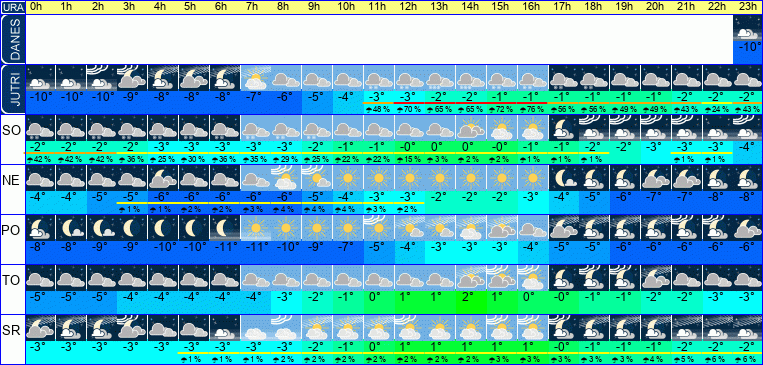 | Ura | 00h | 01h | 02h | 03h | 04h | 05h | 06h | 07h | 08h | 09h | 10h | 11h | 12h | 13h | 14h | 15h | 16h | 17h | 18h | 19h | 20h | 21h | 22h | 23h | |  |  |  |  |  |  |  |  |  |  |  |  |  |  |  |  |  |  |  |  |  |  |  |  | | Temperatura [C°] | -10°C | -11°C | -11°C | -11°C | -11°C | -12°C | -12°C | -12°C | -11°C | -9°C | -7°C | -6°C | -4°C | -3°C | -3°C | -3°C | -4°C | -5°C | -5°C | -5°C | -5°C | -5°C | -5°C | -5°C | | Občutek [C°] | -14°C | -15°C | -15°C | -15°C | -15°C | -16°C | -16°C | -16°C | -15°C | -13°C | -11°C | -10°C | -8°C | -7°C | -7°C | -7°C | -8°C | -8°C | -9°C | -9°C | -9°C | -9°C | -9°C | -9°C | | Možnost padavin | 1 % | 1 % | | | | | | | | | | | | | | 1 % | 1 % | 1 % | 1 % | 8 % | 8 % | 1 % | 1 % | 1 % | | Količina padavin [mm] | | | | | | | | | | | | | | | | | | | | | | | | | Sneg [cm] | | | | | | | | | | | | | | | | | | | | | | | | | | UV index | | | | | | | | | | | | UV 1 | UV 1 | UV 1 | UV 1 | UV 1 | | | | | | | | | | Hitrost vetra | 3 km/h | 3 km/h | 3 km/h | 3 km/h | 3 km/h | 3 km/h | 3 km/h | 3 km/h | 3 km/h | 2 km/h | 2 km/h | 3 km/h | 4 km/h | 4 km/h | 5 km/h | 4 km/h | 4 km/h | 4 km/h | 4 km/h | 3 km/h | 3 km/h | 3 km/h | 3 km/h | 3 km/h | Smer vetra | Z | Z | Z | Z | Z | Z | Z | J | J | J | J | J | J | J | J | J | J | J | J | J | Z | Z | Z | Z | | Zračni tlak | 1026 | 1026 | 1026 | 1026 | 1026 | 1026 | 1026 | 1026 | 1025 | 1025 | 1025 | 1024 | 1024 | 1023 | 1023 | 1022 | 1022 | 1022 | 1022 | 1022 | 1022 | 1022 | 1021 | 1021 | | Vlaga | 69 % | 71 % | 73 % | 74 % | 77 % | 79 % | 80 % | 79 % | 77 % | 75 % | 72 % | 69 % | 67 % | 65 % | 65 % | 70 % | 76 % | 80 % | 81 % | 82 % | 83 % | 84 % | 84 % | 88 % |