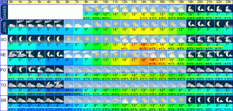 | Ura | 00h | 01h | 02h | 03h | 04h | 05h | 06h | 07h | 08h | 09h | 10h | 11h | 12h | 13h | 14h | 15h | 16h | 17h | 18h | 19h | 20h | 21h | 22h | 23h | |  |  |  |  |  |  |  |  |  |  |  |  |  |  |  |  |  |  |  |  |  |  |  |  | | Temperatura [C°] | 7°C | 6°C | 6°C | 5°C | 5°C | 5°C | 5°C | 6°C | 9°C | 11°C | 13°C | 15°C | 16°C | 17°C | 18°C | 17°C | 16°C | 14°C | 13°C | 11°C | 10°C | 8°C | 8°C | 7°C | | Občutek [C°] | 4°C | 4°C | 3°C | 3°C | 3°C | 3°C | 3°C | 4°C | 6°C | 8°C | 10°C | 12°C | 13°C | 13°C | 14°C | 14°C | 13°C | 11°C | 10°C | 9°C | 8°C | 7°C | 6°C | 5°C | | Možnost padavin | | | | | | | | | | | | | 6 % | | 1 % | 3 % | 5 % | 5 % | 5 % | 5 % | 4 % | 2 % | 1 % | | | Količina padavin [mm] | | | | | | | | | | | | | | | | | | | | | | | | | Sneg [cm] | | | | | | | | | | | | | | | | | | | | | | | | | | UV index | | | | | | | | | | UV 1 | UV 1 | UV 2 | UV 3 | UV 3 | UV 3 | UV 2 | UV 1 | | | | | | | | | Hitrost vetra | 5 km/h | 5 km/h | 4 km/h | 4 km/h | 4 km/h | 4 km/h | 4 km/h | 5 km/h | 6 km/h | 9 km/h | 10 km/h | 11 km/h | 12 km/h | 12 km/h | 12 km/h | 12 km/h | 11 km/h | 10 km/h | 8 km/h | 7 km/h | 5 km/h | 5 km/h | 5 km/h | 5 km/h | Smer vetra | J | J | J | J | J | J | J | J | J | J | J | J | J | J | J | J | J | J | J | J | J | J | J | J | | Zračni tlak | 1011 | 1010 | 1010 | 1009 | 1009 | 1008 | 1008 | 1008 | 1008 | 1007 | 1007 | 1007 | 1006 | 1006 | 1006 | 1006 | 1006 | 1006 | 1007 | 1007 | 1008 | 1008 | 1008 | 1009 | | Vlaga | 87 % | 86 % | 85 % | 87 % | 90 % | 92 % | 91 % | 85 % | 75 % | 65 % | 57 % | 50 % | 46 % | 44 % | 42 % | 44 % | 48 % | 54 % | 63 % | 72 % | 78 % | 83 % | 86 % | 88 % |