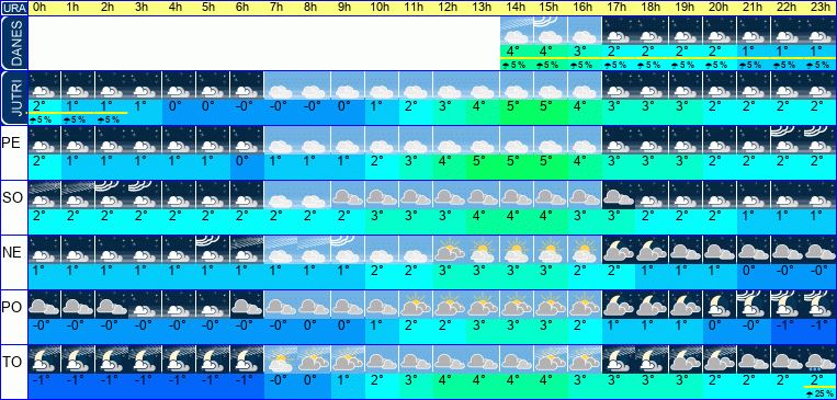| Ura | 00h | 01h | 02h | 03h | 04h | 05h | 06h | 07h | 08h | 09h | 10h | 11h | 12h | 13h | 14h | 15h | 16h | 17h | 18h | 19h | 20h | 21h | 22h | 23h | |  |  |  |  |  |  |  |  |  |  |  |  |  |  |  |  |  |  |  |  |  |  |  |  | | Temperatura [C°] | -1°C | -1°C | -1°C | -1°C | -1°C | -1°C | -1°C | -0°C | 0°C | 1°C | 2°C | 3°C | 4°C | 4°C | 4°C | 4°C | 3°C | 3°C | 3°C | 3°C | 2°C | 2°C | 2°C | 2°C | | Občutek [C°] | -4°C | -4°C | -4°C | -4°C | -4°C | -4°C | -3°C | -3°C | -3°C | -2°C | -1°C | 0°C | 1°C | 2°C | 2°C | 1°C | 1°C | 0°C | 0°C | 0°C | -0°C | -0°C | -1°C | -1°C | | Možnost padavin | | | | | | | | | | | | | | | | | | | | | | | | 25 % | | Količina padavin [mm] | | | | | | | | | | | | | | | | | | | | | | | | | Sneg [cm] | | | | | | | | | | | | | | | | | | | | | | | | | | UV index | | | | | | | | | | | | | UV 1 | UV 1 | UV 1 | | | | | | | | | | | Hitrost vetra | 3 km/h | 3 km/h | 3 km/h | 3 km/h | 3 km/h | 3 km/h | 3 km/h | 3 km/h | 3 km/h | 3 km/h | 3 km/h | 3 km/h | 4 km/h | 4 km/h | 4 km/h | 4 km/h | 3 km/h | 3 km/h | 3 km/h | 3 km/h | 3 km/h | 2 km/h | 2 km/h | 2 km/h | Smer vetra | J | J | J | J | J | J | J | J | J | J | J | J | J | J | J | J | J | J | J | J | J | J | V | V | | Zračni tlak | 1026 | 1026 | 1026 | 1026 | 1025 | 1025 | 1025 | 1025 | 1025 | 1025 | 1025 | 1025 | 1024 | 1023 | 1023 | 1023 | 1022 | 1023 | 1023 | 1023 | 1023 | 1023 | 1024 | 1024 | | Vlaga | 100 % | 100 % | 100 % | 100 % | 99 % | 99 % | 98 % | 98 % | 98 % | 98 % | 97 % | 93 % | 90 % | 88 % | 88 % | 90 % | 92 % | 93 % | 93 % | 93 % | 93 % | 94 % | 94 % | 95 % |