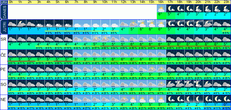 | Ura | 00h | 01h | 02h | 03h | 04h | 05h | 06h | 07h | 08h | 09h | 10h | 11h | 12h | 13h | 14h | 15h | 16h | 17h | 18h | 19h | 20h | 21h | 22h | 23h | |  |  |  |  |  |  |  |  |  |  |  |  |  |  |  |  |  |  |  |  |  |  |  |  | | Temperatura [C°] | 5°C | 5°C | 5°C | 5°C | 5°C | 5°C | 5°C | 5°C | 5°C | 5°C | 5°C | 6°C | 6°C | 6°C | 6°C | 6°C | 6°C | 5°C | 5°C | 5°C | 5°C | 5°C | 4°C | 4°C | | Občutek [C°] | 4°C | 3°C | 3°C | 3°C | 3°C | 3°C | 3°C | 3°C | 3°C | 3°C | 4°C | 4°C | 4°C | 4°C | 4°C | 4°C | 4°C | 3°C | 3°C | 3°C | 3°C | 3°C | 2°C | 2°C | | Možnost padavin | 91 % | 71 % | 67 % | 53 % | 59 % | 66 % | 73 % | 48 % | 48 % | 48 % | 53 % | 47 % | 39 % | 46 % | 35 % | 27 % | 25 % | 31 % | 30 % | 42 % | 41 % | 41 % | 34 % | 27 % | | Količina padavin [mm] | 1 mm | 1 mm | 2 mm | | | 1 mm | 1 mm | | | | | | | | | | | | | 1 mm | 1 mm | | | | Sneg [cm] | | | | | | | | | | | | | | | | | | | | | | | | | | UV index | | | | | | | | | | | | | | UV 1 | | | | | | | | | | | | Hitrost vetra | 1 km/h | 1 km/h | 2 km/h | 1 km/h | 1 km/h | 1 km/h | 1 km/h | 2 km/h | 2 km/h | 2 km/h | 1 km/h | 1 km/h | 1 km/h | 2 km/h | 2 km/h | 3 km/h | 4 km/h | 3 km/h | 3 km/h | 2 km/h | 2 km/h | 2 km/h | 2 km/h | 2 km/h | Smer vetra | S | S | S | S | S | S | V | J | S | S | S | S | V | V | V | V | V | V | V | V | V | V | V | V | | Zračni tlak | 994 | 994 | 995 | 995 | 995 | 996 | 996 | 997 | 998 | 998 | 999 | 999 | 999 | 999 | 1000 | 1000 | 1000 | 1001 | 1001 | 1002 | 1002 | 1002 | 1002 | 1002 | | Vlaga | 96 % | 96 % | 97 % | 96 % | 96 % | 95 % | 94 % | 95 % | 94 % | 93 % | 91 % | 90 % | 88 % | 86 % | 84 % | 84 % | 86 % | 89 % | 90 % | 90 % | 91 % | 91 % | 92 % | 92 % |
