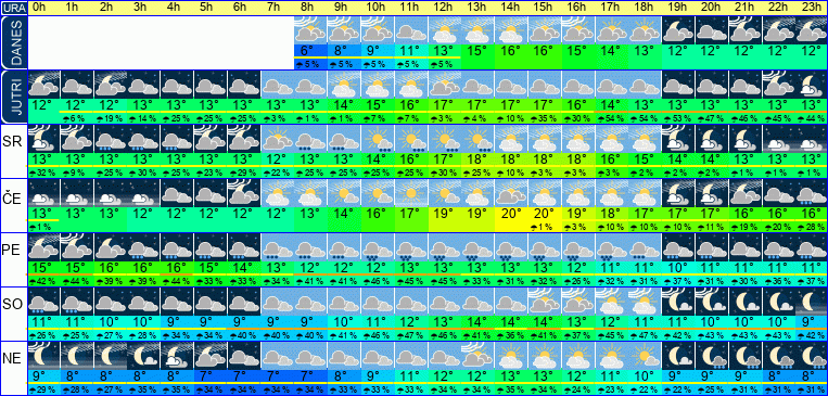 Temperatura: | 6°C / 11°C / 16°C (+-1°C) | Možnost padavin: | 5 % | Hitrost vetra: | 1 / 8 / 14 km/h (+-4) | Skupna oblačnost: | 30 / 84 / 99 % (+-8) |
