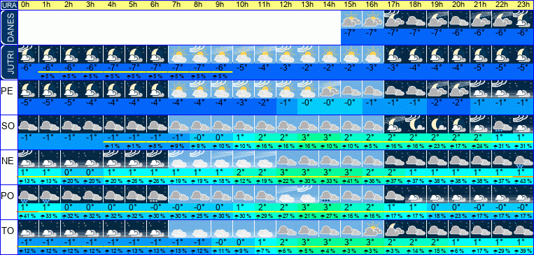 | Ura | 12h | 13h | 14h | 15h | 16h | 17h | 18h | 19h | 20h | 21h | 22h | 23h | | | | | | | | | | | | | |  |  |  |  |  |  |  |  |  |  |  |  | | Temperatura [C°] | -5°C | -5°C | -5°C | -6°C | -6°C | -6°C | -6°C | -6°C | -6°C | -6°C | -6°C | -6°C | | Občutek [C°] | -9°C | -9°C | -9°C | -10°C | -10°C | -10°C | -10°C | -10°C | -10°C | -10°C | -9°C | -9°C | | Možnost padavin | | | | | | | | | | | | | | Količina padavin [mm] | | | | | | | | | | | | | Sneg [cm] | | | | | | | | | | | | | | UV index | UV 1 | UV 1 | UV 1 | | | | | | | | | | | Hitrost vetra | 4 km/h | 4 km/h | 3 km/h | 6 km/h | 6 km/h | 6 km/h | 5 km/h | 4 km/h | 4 km/h | 5 km/h | 4 km/h | 4 km/h | Smer vetra | J | J | J | J | J | J | J | V | V | V | V | J | | Zračni tlak | 1017 | 1016 | 1015 | 1015 | 1014 | 1013 | 1013 | 1013 | 1012 | 1012 | 1011 | 1010 | | Vlaga | 83 % | 82 % | 82 % | 84 % | 86 % | 87 % | 86 % | 87 % | 86 % | 86 % | 85 % | 84 % |