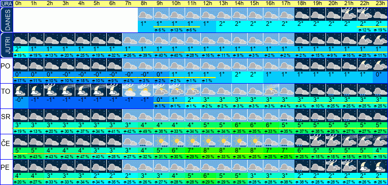 | Ura | 07h | 08h | 09h | 10h | 11h | 12h | 13h | 14h | 15h | 16h | 17h | 18h | 19h | 20h | 21h | 22h | 23h | | | | | | | | |  |  |  |  |  |  |  |  |  |  |  |  |  |  |  |  |  | | Temperatura [C°] | 1°C | 1°C | 1°C | 1°C | 1°C | 1°C | 2°C | 2°C | 2°C | 2°C | 2°C | 2°C | 2°C | 2°C | 2°C | 2°C | 2°C | | Občutek [C°] | -1°C | -2°C | -2°C | -2°C | -2°C | -2°C | -1°C | -1°C | -1°C | -1°C | -1°C | -1°C | -1°C | -1°C | -1°C | -0°C | -0°C | | Možnost padavin | 25 % | | 6 % | 13 % | 6 % | | | | | | | | | | | 12 % | 19 % | | Količina padavin [mm] | | | | | | | | | | | | | | | | | | Sneg [cm] | | | | | | | | | | | | | | | | | | | UV index | | | | | | | | | | | | | | | | | | | Hitrost vetra | 4 km/h | 5 km/h | 5 km/h | 6 km/h | 5 km/h | 5 km/h | 5 km/h | 6 km/h | 5 km/h | 5 km/h | 5 km/h | 4 km/h | 4 km/h | 4 km/h | 4 km/h | 3 km/h | 4 km/h | Smer vetra | S | S | S | V | V | S | S | V | V | V | V | V | V | S | S | S | S | | Zračni tlak | 1005 | 1006 | 1006 | 1007 | 1007 | 1007 | 1007 | 1007 | 1008 | 1008 | 1008 | 1009 | 1009 | 1010 | 1010 | 1010 | 1011 | | Vlaga | 98 % | 97 % | 96 % | 95 % | 95 % | 95 % | 95 % | 94 % | 95 % | 96 % | 97 % | 97 % | 97 % | 97 % | 97 % | 97 % | 96 % |
