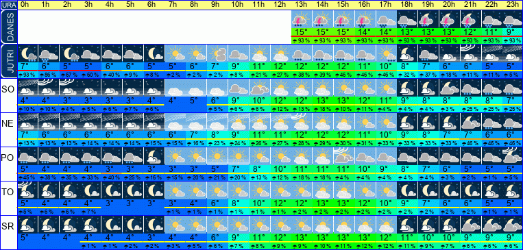 Ura | 09h | 10h | 11h | 12h | 13h | 14h | 15h | 16h | 17h | 18h | 19h | 20h | 21h | 22h | 23h | | | | | | | | | | |  |  |  |  |  |  |  |  |  |  |  |  |  |  |  | Temperatura [C°] | 14°C | 15°C | 15°C | 16°C | 16°C | 15°C | 15°C | 15°C | 14°C | 13°C | 13°C | 13°C | 12°C | 11°C | 9°C | Občutek [C°] | 14°C | 15°C | 15°C | 15°C | 15°C | 14°C | 13°C | 13°C | 12°C | 12°C | 12°C | 11°C | 10°C | 8°C | 6°C | Možnost padavin | 73 % | 79 % | 73 % | 93 % | 93 % | 93 % | 93 % | 93 % | 93 % | 93 % | 93 % | 93 % | 93 % | 93 % | 86 % | Količina padavin [mm] | | | | 1 mm | 2 mm | 2 mm | 2 mm | 4 mm | 4 mm | 4 mm | 2 mm | 5 mm | 4 mm | 6 mm | 7 mm | Sneg [cm] | | | | | | | | | | | | | | | | UV index | | | | | | | | | | | | | | | | Hitrost vetra | 5 km/h | 6 km/h | 7 km/h | 10 km/h | 12 km/h | 15 km/h | 16 km/h | 15 km/h | 13 km/h | 13 km/h | 12 km/h | 12 km/h | 13 km/h | 14 km/h | 14 km/h | Smer vetra | J | J | J | J | J | J | J | J | J | J | J | J | J | Z | Z | Zračni tlak | 1004 | 1003 | 1002 | 1001 | 1000 | 999 | 998 | 996 | 995 | 994 | 993 | 993 | 993 | 993 | 994 | Vlaga | 99 % | 99 % | 95 % | 93 % | 93 % | 92 % | 91 % | 94 % | 95 % | 98 % | 100 % | 96 % | 94 % | 92 % | 94 % |