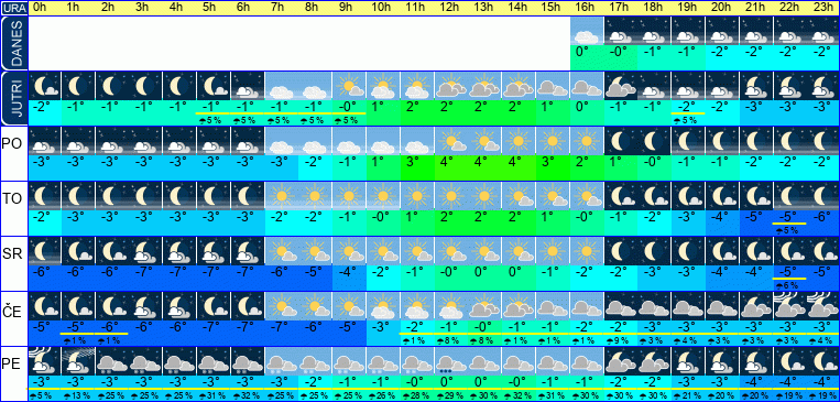 | Ura | 00h | 01h | 02h | 03h | 04h | 05h | 06h | 07h | 08h | 09h | 10h | 11h | 12h | 13h | 14h | 15h | 16h | 17h | 18h | 19h | 20h | 21h | 22h | 23h | |  |  |  |  |  |  |  |  |  |  |  |  |  |  |  |  |  |  |  |  |  |  |  |  | | Temperatura [C°] | -2°C | -3°C | -3°C | -3°C | -3°C | -3°C | -3°C | -2°C | -2°C | -1°C | -0°C | 1°C | 2°C | 2°C | 2°C | 1°C | -0°C | -1°C | -2°C | -3°C | -4°C | -5°C | -5°C | -6°C | | Občutek [C°] | -6°C | -6°C | -6°C | -6°C | -6°C | -6°C | -6°C | -5°C | -5°C | -4°C | -3°C | -3°C | -2°C | -2°C | -2°C | -3°C | -4°C | -5°C | -6°C | -7°C | -8°C | -8°C | -9°C | -9°C | | Možnost padavin | | | | | | | | | | | | | | | | | | | | | | | 5 % | | | Količina padavin [mm] | | | | | | | | | | | | | | | | | | | | | | | | | Sneg [cm] | | | | | | | | | | | | | | | | | | | | | | | | | | UV index | | | | | | | | | | | | UV 1 | UV 1 | UV 1 | UV 1 | UV 1 | | | | | | | | | | Hitrost vetra | 5 km/h | 5 km/h | 4 km/h | 4 km/h | 4 km/h | 3 km/h | 3 km/h | 2 km/h | 2 km/h | 3 km/h | 3 km/h | 4 km/h | 5 km/h | 6 km/h | 6 km/h | 7 km/h | 7 km/h | 7 km/h | 6 km/h | 5 km/h | 5 km/h | 5 km/h | 4 km/h | 4 km/h | Smer vetra | Z | Z | Z | Z | Z | Z | Z | Z | Z | S | V | V | V | V | V | V | V | V | V | V | V | V | V | V | | Zračni tlak | 1016 | 1016 | 1016 | 1016 | 1015 | 1015 | 1015 | 1016 | 1016 | 1017 | 1018 | 1018 | 1018 | 1018 | 1018 | 1019 | 1019 | 1020 | 1021 | 1022 | 1022 | 1022 | 1023 | 1023 | | Vlaga | 86 % | 85 % | 89 % | 90 % | 91 % | 92 % | 92 % | 94 % | 93 % | 90 % | 85 % | 79 % | 72 % | 68 % | 67 % | 69 % | 72 % | 76 % | 80 % | 84 % | 86 % | 89 % | 90 % | 91 % |