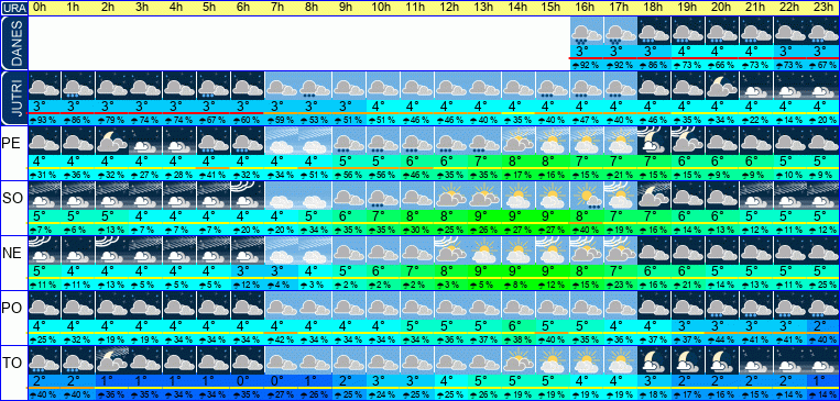 | Ura | 15h | 16h | 17h | 18h | 19h | 20h | 21h | 22h | 23h | | | | | | | | | | | | | | | | |  |  |  |  |  |  |  |  |  | | Temperatura [C°] | 4°C | 4°C | 4°C | 4°C | 4°C | 4°C | 4°C | 4°C | 4°C | | Občutek [C°] | 1°C | 1°C | 1°C | 1°C | 1°C | 1°C | 1°C | 1°C | 1°C | | Možnost padavin | 93 % | 92 % | 92 % | 86 % | 73 % | 66 % | 73 % | 73 % | 67 % | | Količina padavin [mm] | 3 mm | 3 mm | 3 mm | 1 mm | 1 mm | | | | | Sneg [cm] | | | | | | | | | | | UV index | | | | | | | | | | | Hitrost vetra | 6 km/h | 6 km/h | 6 km/h | 6 km/h | 6 km/h | 6 km/h | 5 km/h | 5 km/h | 6 km/h | Smer vetra | V | S | S | S | S | S | S | S | S | | Zračni tlak | 999 | 999 | 998 | 998 | 997 | 997 | 997 | 996 | 996 | | Vlaga | 100 % | 100 % | 99 % | 97 % | 96 % | 95 % | 95 % | 95 % | 96 % |