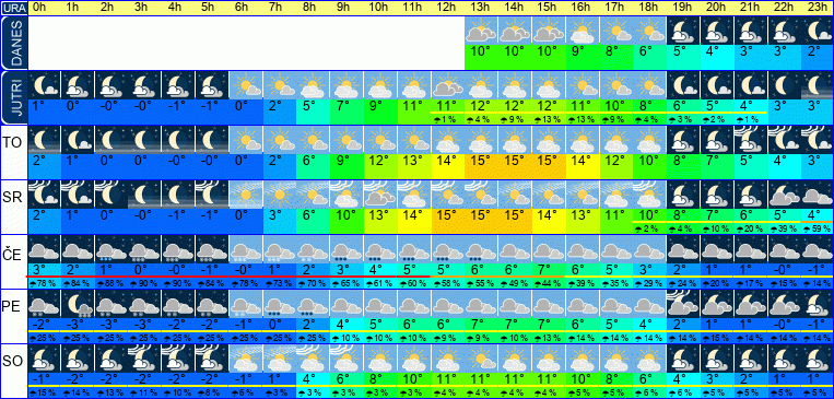 | Ura | 00h | 01h | 02h | 03h | 04h | 05h | 06h | 07h | 08h | 09h | 10h | 11h | 12h | 13h | 14h | 15h | 16h | 17h | 18h | 19h | 20h | 21h | 22h | 23h | |  |  |  |  |  |  |  |  |  |  |  |  |  |  |  |  |  |  |  |  |  |  |  |  | | Temperatura [C°] | -1°C | -1°C | -2°C | -2°C | -2°C | -1°C | -0°C | 1°C | 4°C | 7°C | 8°C | 9°C | 10°C | 11°C | 11°C | 10°C | 10°C | 8°C | 6°C | 5°C | 3°C | 2°C | 2°C | 1°C | | Občutek [C°] | -6°C | -6°C | -6°C | -6°C | -6°C | -6°C | -5°C | -3°C | -0°C | 2°C | 4°C | 5°C | 6°C | 6°C | 6°C | 6°C | 5°C | 4°C | 2°C | 1°C | -0°C | -1°C | -2°C | -3°C | | Možnost padavin | 15 % | 14 % | 13 % | 11 % | 10 % | 8 % | 6 % | 3 % | 3 % | 3 % | 3 % | 3 % | 4 % | 4 % | 4 % | 4 % | 5 % | 5 % | 6 % | 6 % | 5 % | 5 % | 5 % | 5 % | | Količina padavin [mm] | | | | | | | | | | | | | | | | | | | | | | | | | Sneg [cm] | | | | | | | | | | | | | | | | | | | | | | | | | | UV index | | | | | | | | | | UV 1 | UV 1 | UV 2 | UV 3 | UV 3 | UV 3 | UV 2 | UV 1 | UV 1 | | | | | | | | Hitrost vetra | 9 km/h | 8 km/h | 9 km/h | 9 km/h | 8 km/h | 7 km/h | 7 km/h | 7 km/h | 8 km/h | 9 km/h | 10 km/h | 11 km/h | 12 km/h | 12 km/h | 12 km/h | 11 km/h | 11 km/h | 10 km/h | 8 km/h | 7 km/h | 7 km/h | 7 km/h | 7 km/h | 7 km/h | Smer vetra | S | S | S | S | S | S | S | S | S | S | S | S | S | S | S | S | S | S | S | S | S | S | S | S | | Zračni tlak | 1014 | 1014 | 1014 | 1014 | 1014 | 1014 | 1014 | 1015 | 1015 | 1015 | 1014 | 1014 | 1014 | 1014 | 1013 | 1013 | 1013 | 1013 | 1014 | 1014 | 1015 | 1015 | 1015 | 1015 | | Vlaga | 64 % | 66 % | 66 % | 68 % | 70 % | 72 % | 69 % | 66 % | 54 % | 46 % | 40 % | 36 % | 34 % | 33 % | 35 % | 36 % | 38 % | 43 % | 53 % | 60 % | 64 % | 65 % | 67 % | 70 % |