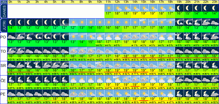 Ura | 00h | 01h | 02h | 03h | 04h | 05h | 06h | 07h | 08h | 09h | 10h | 11h | 12h | 13h | 14h | 15h | 16h | 17h | 18h | 19h | 20h | 21h | 22h | 23h | |  |  |  |  |  |  |  |  |  |  |  |  |  |  |  |  |  |  |  |  |  |  |  |  | Temperatura [C°] | 13°C | 13°C | 13°C | 12°C | 12°C | 12°C | 11°C | 11°C | 12°C | 13°C | 14°C | 16°C | 16°C | 17°C | 17°C | 17°C | 17°C | 16°C | 15°C | 14°C | 14°C | 13°C | 13°C | 13°C | Občutek [C°] | 10°C | 10°C | 11°C | 9°C | 9°C | 9°C | 9°C | 9°C | 10°C | 11°C | 12°C | 14°C | 15°C | 15°C | 15°C | 15°C | 15°C | 14°C | 14°C | 13°C | 12°C | 12°C | 12°C | 11°C | Možnost padavin | | | | | | | | | | | | | | | | | | | | | | | | | Količina padavin [mm] | | | | | | | | | | | | | | | | | | | | | | | | | Sneg [cm] | | | | | | | | | | | | | | | | | | | | | | | | | UV index | | | | | | | | | | | UV 1 | UV 1 | UV 2 | UV 3 | UV 3 | UV 3 | UV 2 | UV 1 | | | | | | | Hitrost vetra | 14 km/h | 14 km/h | 14 km/h | 14 km/h | 14 km/h | 13 km/h | 12 km/h | 12 km/h | 11 km/h | 10 km/h | 9 km/h | 8 km/h | 7 km/h | 6 km/h | 6 km/h | 5 km/h | 5 km/h | 5 km/h | 5 km/h | 5 km/h | 4 km/h | 4 km/h | 4 km/h | 4 km/h | Smer vetra | V | S | S | V | V | S | S | S | S | S | Z | Z | Z | Z | Z | Z | Z | Z | Z | Z | Z | Z | S | S | Zračni tlak | 1023 | 1024 | 1024 | 1024 | 1024 | 1024 | 1024 | 1024 | 1024 | 1023 | 1023 | 1023 | 1022 | 1022 | 1021 | 1021 | 1020 | 1020 | 1020 | 1020 | 1020 | 1020 | 1019 | 1019 | Vlaga | 67 % | 72 % | 97 % | 83 % | 87 % | 84 % | 93 % | 93 % | 85 % | 76 % | 71 % | 67 % | 63 % | 59 % | 51 % | 47 % | 48 % | 50 % | 58 % | 64 % | 64 % | 74 % | 74 % | 70 % |