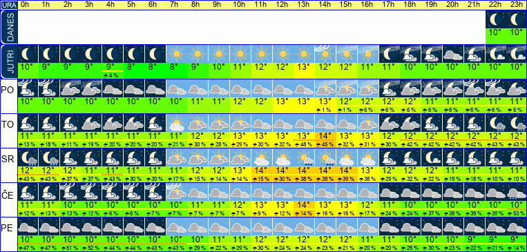 | Ura | 00h | 01h | 02h | 03h | 04h | 05h | 06h | 07h | 08h | 09h | 10h | 11h | 12h | 13h | 14h | 15h | 16h | 17h | 18h | 19h | 20h | 21h | 22h | 23h | |  |  |  |  |  |  |  |  |  |  |  |  |  |  |  |  |  |  |  |  |  |  |  |  | | Temperatura [C°] | 10°C | 10°C | 10°C | 10°C | 10°C | 10°C | 10°C | 10°C | 11°C | 11°C | 12°C | 12°C | 13°C | 13°C | 13°C | 13°C | 12°C | 12°C | 12°C | 11°C | 11°C | 11°C | 11°C | 11°C | | Občutek [C°] | 7°C | 8°C | 8°C | 8°C | 8°C | 8°C | 8°C | 8°C | 9°C | 9°C | 10°C | 11°C | 11°C | 11°C | 11°C | 11°C | 11°C | 10°C | 10°C | 10°C | 10°C | 10°C | 10°C | 10°C | | Možnost padavin | | | | | | | | | | 5 % | 5 % | 5 % | 5 % | 6 % | 1 % | 1 % | 2 % | 2 % | 2 % | 2 % | 2 % | 8 % | 9 % | 9 % | | Količina padavin [mm] | | | | | | | | | | | | | | | | | | | | | | | | | Sneg [cm] | | | | | | | | | | | | | | | | | | | | | | | | | | UV index | | | | | | | | | | | | | UV 1 | UV 1 | | | | | | | | | | | | Hitrost vetra | 5 km/h | 5 km/h | 5 km/h | 5 km/h | 5 km/h | 5 km/h | 5 km/h | 5 km/h | 5 km/h | 5 km/h | 5 km/h | 5 km/h | 5 km/h | 5 km/h | 4 km/h | 4 km/h | 4 km/h | 4 km/h | 4 km/h | 4 km/h | 5 km/h | 5 km/h | 5 km/h | 5 km/h | Smer vetra | J | J | J | J | J | J | J | J | J | J | J | J | J | J | J | J | V | V | V | V | V | V | V | V | | Zračni tlak | 1019 | 1019 | 1019 | 1019 | 1019 | 1020 | 1020 | 1021 | 1021 | 1021 | 1022 | 1021 | 1021 | 1021 | 1021 | 1021 | 1021 | 1021 | 1022 | 1022 | 1022 | 1022 | 1022 | 1021 | | Vlaga | 73 % | 72 % | 76 % | 79 % | 79 % | 78 % | 81 % | 83 % | 78 % | 73 % | 69 % | 66 % | 66 % | 66 % | 66 % | 67 % | 68 % | 71 % | 73 % | 75 % | 76 % | 77 % | 77 % | 75 % |