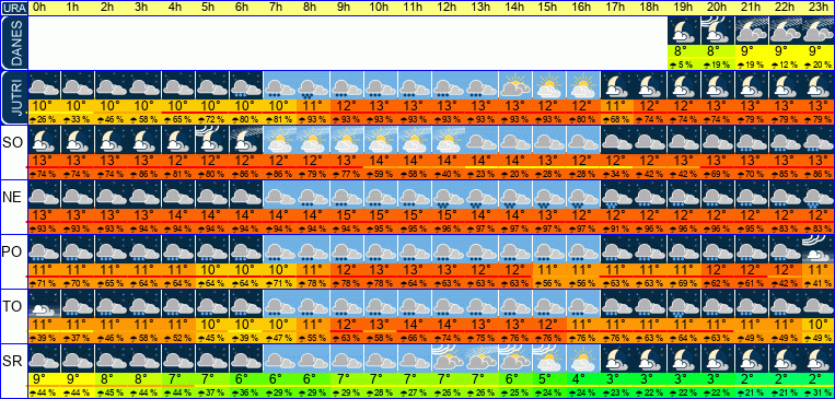 | Ura | 00h | 01h | 02h | 03h | 04h | 05h | 06h | 07h | 08h | 09h | 10h | 11h | 12h | 13h | 14h | 15h | 16h | 17h | 18h | 19h | 20h | 21h | 22h | 23h | |  |  |  |  |  |  |  |  |  |  |  |  |  |  |  |  |  |  |  |  |  |  |  |  | | Temperatura [C°] | 11°C | 11°C | 11°C | 10°C | 10°C | 10°C | 10°C | 10°C | 11°C | 12°C | 13°C | 13°C | 13°C | 12°C | 12°C | 11°C | 11°C | 11°C | 11°C | 11°C | 11°C | 12°C | 11°C | 11°C | | Občutek [C°] | 9°C | 9°C | 8°C | 8°C | 8°C | 8°C | 8°C | 8°C | 9°C | 10°C | 11°C | 11°C | 11°C | 10°C | 10°C | 9°C | 8°C | 8°C | 8°C | 9°C | 9°C | 9°C | 9°C | 9°C | | Možnost padavin | 71 % | 71 % | 65 % | 65 % | 64 % | 64 % | 64 % | 71 % | 78 % | 78 % | 78 % | 65 % | 65 % | 64 % | 64 % | 57 % | 56 % | 62 % | 62 % | 68 % | 60 % | 58 % | 40 % | 40 % | | Količina padavin [mm] | 2 mm | 2 mm | 2 mm | 1 mm | 1 mm | 1 mm | 1 mm | 1 mm | 1 mm | 1 mm | 1 mm | 1 mm | 1 mm | 2 mm | 1 mm | 1 mm | 1 mm | 1 mm | 1 mm | 1 mm | 1 mm | | | | Sneg [cm] | | | | | | | | | | | | | | | | | | | | | | | | | | UV index | | | | | | | | | | | | | | | | | | | | | | | | | | Hitrost vetra | 10 km/h | 10 km/h | 10 km/h | 10 km/h | 10 km/h | 10 km/h | 9 km/h | 9 km/h | 9 km/h | 10 km/h | 9 km/h | 9 km/h | 8 km/h | 8 km/h | 7 km/h | 7 km/h | 7 km/h | 7 km/h | 7 km/h | 7 km/h | 7 km/h | 7 km/h | 7 km/h | 6 km/h | Smer vetra | V | V | V | V | V | V | V | J | V | V | V | V | J | J | J | J | J | V | V | V | V | V | V | V | | Zračni tlak | 1009 | 1009 | 1009 | 1008 | 1008 | 1008 | 1008 | 1008 | 1008 | 1008 | 1009 | 1008 | 1008 | 1008 | 1008 | 1008 | 1008 | 1008 | 1008 | 1008 | 1009 | 1009 | 1009 | 1009 | | Vlaga | 82 % | 85 % | 87 % | 90 % | 92 % | 95 % | 97 % | 96 % | 89 % | 81 % | 74 % | 73 % | 73 % | 72 % | 70 % | 69 % | 67 % | 64 % | 62 % | 62 % | 63 % | 67 % | 70 % | 74 % |