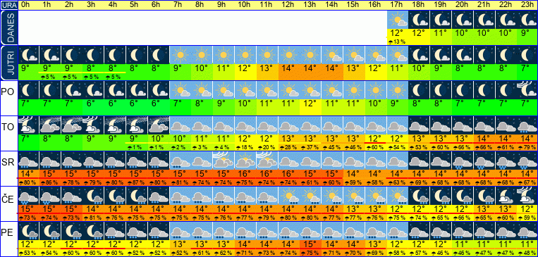 | Ura | 00h | 01h | 02h | 03h | 04h | 05h | 06h | 07h | 08h | 09h | 10h | 11h | 12h | 13h | 14h | 15h | 16h | 17h | 18h | 19h | 20h | 21h | 22h | 23h | |  |  |  |  |  |  |  |  |  |  |  |  |  |  |  |  |  |  |  |  |  |  |  |  | | Temperatura [C°] | 7°C | 8°C | 8°C | 9°C | 9°C | 9°C | 10°C | 10°C | 11°C | 11°C | 12°C | 12°C | 13°C | 13°C | 13°C | 13°C | 12°C | 12°C | 13°C | 13°C | 13°C | 14°C | 14°C | 14°C | | Občutek [C°] | 4°C | 5°C | 5°C | 5°C | 5°C | 6°C | 6°C | 6°C | 7°C | 7°C | 7°C | 8°C | 8°C | 8°C | 8°C | 8°C | 7°C | 7°C | 7°C | 8°C | 8°C | 9°C | 9°C | 10°C | | Možnost padavin | | | | | | | | | 1 % | 1 % | 15 % | 17 % | 25 % | 34 % | 42 % | 44 % | 57 % | 52 % | 50 % | 57 % | 63 % | 63 % | 59 % | 77 % | | Količina padavin [mm] | | | | | | | | | | | | | | | | | | | | | | | | | Sneg [cm] | | | | | | | | | | | | | | | | | | | | | | | | | | UV index | | | | | | | | | | | | | UV 1 | UV 1 | | | | | | | | | | | | Hitrost vetra | 7 km/h | 8 km/h | 9 km/h | 11 km/h | 12 km/h | 13 km/h | 14 km/h | 15 km/h | 16 km/h | 18 km/h | 20 km/h | 22 km/h | 23 km/h | 23 km/h | 25 km/h | 25 km/h | 25 km/h | 26 km/h | 26 km/h | 27 km/h | 27 km/h | 27 km/h | 27 km/h | 26 km/h | Smer vetra | V | V | V | V | V | V | V | V | V | V | V | V | V | V | V | V | V | V | V | V | J | J | J | J | | Zračni tlak | 1013 | 1014 | 1014 | 1014 | 1014 | 1014 | 1013 | 1013 | 1014 | 1014 | 1014 | 1014 | 1013 | 1013 | 1012 | 1012 | 1012 | 1011 | 1011 | 1011 | 1011 | 1010 | 1010 | 1010 | | Vlaga | 76 % | 76 % | 76 % | 75 % | 74 % | 75 % | 75 % | 76 % | 76 % | 76 % | 76 % | 76 % | 76 % | 77 % | 79 % | 80 % | 81 % | 82 % | 82 % | 81 % | 81 % | 81 % | 80 % | 80 % |