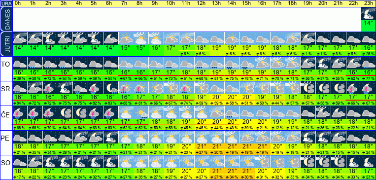 Ura | 00h | 01h | 02h | 03h | 04h | 05h | 06h | 07h | 08h | 09h | 10h | 11h | 12h | 13h | 14h | 15h | 16h | 17h | 18h | 19h | 20h | 21h | 22h | 23h | |  |  |  |  |  |  |  |  |  |  |  |  |  |  |  |  |  |  |  |  |  |  |  |  | Temperatura [C°] | 14°C | 14°C | 14°C | 14°C | 15°C | 15°C | 15°C | 15°C | 15°C | 16°C | 17°C | 17°C | 18°C | 19°C | 19°C | 19°C | 19°C | 18°C | 18°C | 17°C | 17°C | 17°C | 16°C | 16°C | Občutek [C°] | 14°C | 14°C | 13°C | 13°C | 13°C | 12°C | 13°C | 12°C | 12°C | 12°C | 13°C | 14°C | 14°C | 15°C | 15°C | 16°C | 16°C | 15°C | 15°C | 14°C | 14°C | 13°C | 13°C | 13°C | Možnost padavin | | | | | | | | | | | | 6 % | 6 % | 1 % | 6 % | 6 % | 6 % | 6 % | 6 % | 1 % | 1 % | 4 % | 5 % | 25 % | Količina padavin [mm] | | | | | | | | | | | | | | | | | | | | | | | | | Sneg [cm] | | | | | | | | | | | | | | | | | | | | | | | | | UV index | | | | | | | | | | | | UV 1 | UV 2 | UV 2 | UV 2 | UV 2 | UV 1 | | | | | | | | Hitrost vetra | 1 km/h | 2 km/h | 3 km/h | 5 km/h | 6 km/h | 9 km/h | 8 km/h | 13 km/h | 16 km/h | 19 km/h | 20 km/h | 20 km/h | 21 km/h | 22 km/h | 22 km/h | 20 km/h | 20 km/h | 20 km/h | 20 km/h | 21 km/h | 22 km/h | 23 km/h | 22 km/h | 23 km/h | Smer vetra | S | J | J | V | V | V | J | J | J | J | J | J | J | J | J | J | J | J | J | J | J | J | J | J | Zračni tlak | 1018 | 1018 | 1018 | 1017 | 1017 | 1016 | 1016 | 1016 | 1015 | 1015 | 1015 | 1015 | 1015 | 1014 | 1014 | 1013 | 1013 | 1013 | 1012 | 1012 | 1012 | 1012 | 1012 | 1012 | Vlaga | 63 % | 64 % | 65 % | 67 % | 68 % | 68 % | 69 % | 71 % | 70 % | 70 % | 68 % | 66 % | 65 % | 63 % | 62 % | 64 % | 66 % | 69 % | 72 % | 76 % | 78 % | 80 % | 81 % | 81 % |
