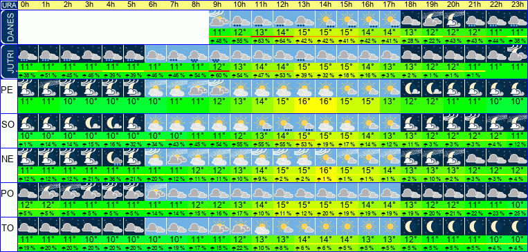 | Ura | 07h | 08h | 09h | 10h | 11h | 12h | 13h | 14h | 15h | 16h | 17h | 18h | 19h | 20h | 21h | 22h | 23h | | | | | | | | |  |  |  |  |  |  |  |  |  |  |  |  |  |  |  |  |  | | Temperatura [C°] | 10°C | 11°C | 12°C | 13°C | 13°C | 14°C | 15°C | 15°C | 15°C | 14°C | 13°C | 13°C | 12°C | 12°C | 11°C | 11°C | 11°C | | Občutek [C°] | 7°C | 7°C | 8°C | 9°C | 10°C | 11°C | 11°C | 12°C | 12°C | 11°C | 11°C | 10°C | 9°C | 8°C | 8°C | 7°C | 7°C | | Možnost padavin | 6 % | 20 % | 48 % | 55 % | 63 % | 64 % | 42 % | 42 % | 41 % | 42 % | 41 % | 28 % | 23 % | 43 % | 44 % | 44 % | 38 % | | Količina padavin [mm] | | | | | | 1 mm | 1 mm | | | | | | | | | 1 mm | 1 mm | Sneg [cm] | | | | | | | | | | | | | | | | | | | UV index | | | | UV 1 | UV 1 | UV 2 | UV 2 | UV 2 | UV 2 | UV 1 | | | | | | | | | Hitrost vetra | 18 km/h | 20 km/h | 21 km/h | 21 km/h | 20 km/h | 19 km/h | 18 km/h | 17 km/h | 16 km/h | 15 km/h | 15 km/h | 16 km/h | 16 km/h | 17 km/h | 18 km/h | 18 km/h | 19 km/h | Smer vetra | J | J | J | J | J | J | J | J | J | J | J | J | J | J | J | J | V | | Zračni tlak | 1024 | 1024 | 1024 | 1025 | 1024 | 1024 | 1023 | 1023 | 1022 | 1022 | 1022 | 1022 | 1022 | 1022 | 1022 | 1022 | 1022 | | Vlaga | 96 % | 94 % | 90 % | 86 % | 82 % | 78 % | 76 % | 76 % | 76 % | 79 % | 83 % | 86 % | 88 % | 88 % | 89 % | 91 % | 92 % |