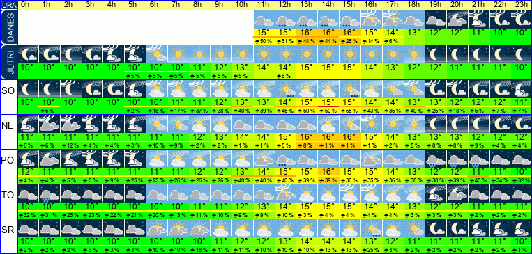 | Ura | 09h | 10h | 11h | 12h | 13h | 14h | 15h | 16h | 17h | 18h | 19h | 20h | 21h | 22h | 23h | | | | | | | | | | |  |  |  |  |  |  |  |  |  |  |  |  |  |  |  | | Temperatura [C°] | 13°C | 14°C | 14°C | 15°C | 15°C | 15°C | 15°C | 14°C | 13°C | 13°C | 12°C | 11°C | 11°C | 10°C | 10°C | | Občutek [C°] | 10°C | 11°C | 12°C | 13°C | 13°C | 13°C | 13°C | 13°C | 12°C | 12°C | 11°C | 10°C | 10°C | 9°C | 8°C | | Možnost padavin | 71 % | 65 % | 64 % | 48 % | 48 % | 48 % | 35 % | 14 % | 7 % | | | | | | | | Količina padavin [mm] | | | | | | | | | | | | | | | | Sneg [cm] | | | | | | | | | | | | | | | | | UV index | | UV 1 | UV 2 | UV 2 | UV 3 | UV 2 | UV 2 | UV 1 | UV 1 | | | | | | | | Hitrost vetra | 17 km/h | 16 km/h | 15 km/h | 13 km/h | 12 km/h | 11 km/h | 9 km/h | 8 km/h | 6 km/h | 5 km/h | 4 km/h | 4 km/h | 6 km/h | 6 km/h | 7 km/h | Smer vetra | J | J | J | J | J | J | J | V | V | V | S | S | S | S | S | | Zračni tlak | 1022 | 1022 | 1022 | 1022 | 1022 | 1022 | 1021 | 1021 | 1021 | 1021 | 1021 | 1022 | 1022 | 1022 | 1021 | | Vlaga | 85 % | 81 % | 78 % | 77 % | 73 % | 73 % | 76 % | 78 % | 83 % | 85 % | 87 % | 88 % | 89 % | 90 % | 91 % |