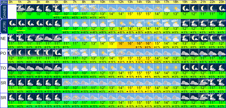 | Ura | 00h | 01h | 02h | 03h | 04h | 05h | 06h | 07h | 08h | 09h | 10h | 11h | 12h | 13h | 14h | 15h | 16h | 17h | 18h | 19h | 20h | 21h | 22h | 23h | |  |  |  |  |  |  |  |  |  |  |  |  |  |  |  |  |  |  |  |  |  |  |  |  | | Temperatura [C°] | 11°C | 11°C | 11°C | 11°C | 11°C | 10°C | 11°C | 11°C | 11°C | 12°C | 13°C | 14°C | 14°C | 15°C | 15°C | 15°C | 14°C | 14°C | 13°C | 12°C | 12°C | 12°C | 11°C | 11°C | | Občutek [C°] | 7°C | 7°C | 7°C | 6°C | 6°C | 6°C | 6°C | 6°C | 6°C | 7°C | 8°C | 9°C | 10°C | 10°C | 11°C | 11°C | 11°C | 10°C | 9°C | 9°C | 8°C | 8°C | 7°C | 7°C | | Možnost padavin | 35 % | 34 % | 32 % | 30 % | 21 % | 20 % | 19 % | 18 % | 17 % | 16 % | 22 % | 21 % | 14 % | 14 % | 14 % | 14 % | 14 % | 13 % | 13 % | 12 % | 12 % | 12 % | 11 % | 10 % | | Količina padavin [mm] | | | | | | | | | | | | | | | | | | | | | | | | | Sneg [cm] | | | | | | | | | | | | | | | | | | | | | | | | | | UV index | | | | | | | | | | | UV 1 | UV 2 | UV 2 | UV 3 | UV 3 | UV 2 | UV 1 | UV 1 | | | | | | | | Hitrost vetra | 16 km/h | 17 km/h | 19 km/h | 20 km/h | 20 km/h | 20 km/h | 21 km/h | 21 km/h | 21 km/h | 21 km/h | 20 km/h | 20 km/h | 20 km/h | 19 km/h | 16 km/h | 17 km/h | 16 km/h | 16 km/h | 16 km/h | 16 km/h | 16 km/h | 16 km/h | 16 km/h | 16 km/h | Smer vetra | S | S | S | S | S | S | S | S | V | V | V | V | V | V | V | V | V | V | V | V | S | S | S | S | | Zračni tlak | 1012 | 1012 | 1012 | 1012 | 1012 | 1013 | 1013 | 1014 | 1014 | 1015 | 1015 | 1015 | 1015 | 1016 | 1016 | 1016 | 1016 | 1016 | 1016 | 1017 | 1017 | 1017 | 1017 | 1017 | | Vlaga | 80 % | 79 % | 80 % | 80 % | 81 % | 81 % | 80 % | 77 % | 75 % | 72 % | 67 % | 63 % | 61 % | 58 % | 61 % | 63 % | 65 % | 68 % | 70 % | 71 % | 72 % | 72 % | 72 % | 72 % |