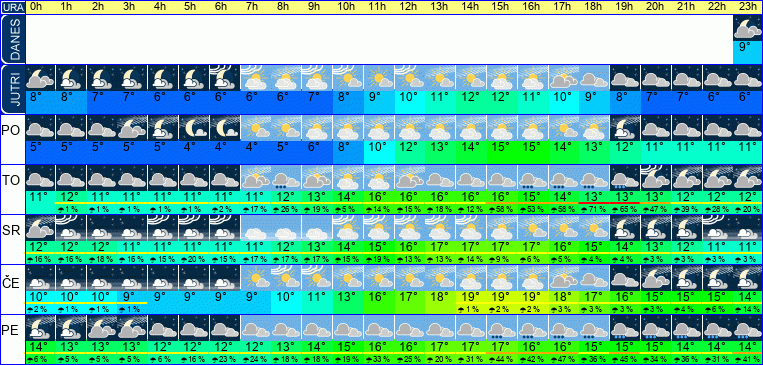 Ura | 00h | 01h | 02h | 03h | 04h | 05h | 06h | 07h | 08h | 09h | 10h | 11h | 12h | 13h | 14h | 15h | 16h | 17h | 18h | 19h | 20h | 21h | 22h | 23h | |  |  |  |  |  |  |  |  |  |  |  |  |  |  |  |  |  |  |  |  |  |  |  |  | Temperatura [C°] | 5°C | 5°C | 5°C | 5°C | 4°C | 4°C | 4°C | 4°C | 5°C | 6°C | 8°C | 10°C | 12°C | 13°C | 14°C | 15°C | 15°C | 14°C | 13°C | 12°C | 11°C | 11°C | 11°C | 11°C | Občutek [C°] | 3°C | 3°C | 2°C | 2°C | 2°C | 2°C | 2°C | 2°C | 3°C | 4°C | 6°C | 8°C | 9°C | 11°C | 12°C | 12°C | 12°C | 11°C | 10°C | 9°C | 9°C | 9°C | 9°C | 9°C | Možnost padavin | | | | | | | | | | | | | | | | | | | | | | | | | Količina padavin [mm] | | | | | | | | | | | | | | | | | | | | | | | | | Sneg [cm] | | | | | | | | | | | | | | | | | | | | | | | | | UV index | | | | | | | | | | | | UV 1 | UV 1 | UV 2 | UV 2 | UV 1 | UV 1 | | | | | | | | Hitrost vetra | 5 km/h | 4 km/h | 4 km/h | 4 km/h | 3 km/h | 3 km/h | 3 km/h | 3 km/h | 3 km/h | 3 km/h | 4 km/h | 5 km/h | 6 km/h | 8 km/h | 10 km/h | 11 km/h | 11 km/h | 12 km/h | 11 km/h | 11 km/h | 11 km/h | 11 km/h | 11 km/h | 11 km/h | Smer vetra | S | J | J | S | S | S | S | S | S | S | V | V | V | J | J | J | J | Z | J | J | J | J | J | J | Zračni tlak | 1019 | 1019 | 1018 | 1018 | 1017 | 1017 | 1016 | 1016 | 1016 | 1016 | 1015 | 1015 | 1014 | 1013 | 1012 | 1011 | 1011 | 1010 | 1010 | 1010 | 1010 | 1010 | 1009 | 1009 | Vlaga | 84 % | 84 % | 87 % | 87 % | 88 % | 90 % | 90 % | 91 % | 89 % | 83 % | 76 % | 69 % | 64 % | 61 % | 59 % | 58 % | 61 % | 67 % | 74 % | 81 % | 84 % | 86 % | 86 % | 85 % |