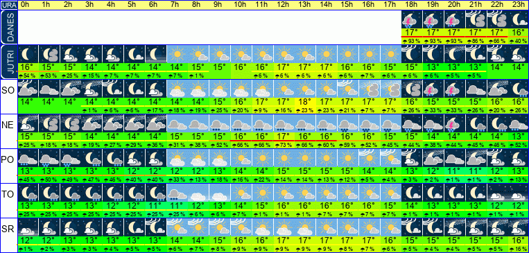 Ura | 00h | 01h | 02h | 03h | 04h | 05h | 06h | 07h | 08h | 09h | 10h | 11h | 12h | 13h | 14h | 15h | 16h | 17h | 18h | 19h | 20h | 21h | 22h | 23h | |  |  |  |  |  |  |  |  |  |  |  |  |  |  |  |  |  |  |  |  |  |  |  |  | Temperatura [C°] | 12°C | 12°C | 12°C | 12°C | 13°C | 13°C | 13°C | 13°C | 14°C | 14°C | 15°C | 16°C | 16°C | 17°C | 17°C | 17°C | 16°C | 16°C | 15°C | 15°C | 14°C | 14°C | 15°C | 15°C | Občutek [C°] | 10°C | 10°C | 10°C | 10°C | 11°C | 11°C | 11°C | 11°C | 11°C | 12°C | 13°C | 14°C | 14°C | 14°C | 15°C | 15°C | 15°C | 14°C | 14°C | 13°C | 13°C | 13°C | 13°C | 14°C | Možnost padavin | 2 % | 2 % | 3 % | 3 % | 4 % | 5 % | 6 % | 6 % | 7 % | 8 % | 9 % | 9 % | 9 % | 9 % | 9 % | 8 % | 7 % | 6 % | 5 % | 4 % | 4 % | 5 % | 5 % | 16 % | Količina padavin [mm] | | | | | | | | | | | | | | | | | | | | | | | | | Sneg [cm] | | | | | | | | | | | | | | | | | | | | | | | | | UV index | | | | | | | | | | | | UV 1 | UV 2 | UV 2 | UV 2 | UV 2 | UV 1 | UV 1 | | | | | | | Hitrost vetra | 6 km/h | 7 km/h | 7 km/h | 7 km/h | 7 km/h | 7 km/h | 7 km/h | 7 km/h | 8 km/h | 8 km/h | 10 km/h | 11 km/h | 11 km/h | 11 km/h | 10 km/h | 9 km/h | 9 km/h | 8 km/h | 8 km/h | 8 km/h | 8 km/h | 8 km/h | 7 km/h | 8 km/h | Smer vetra | S | S | V | V | V | V | V | V | V | V | V | V | V | V | V | V | V | V | V | V | V | V | V | V | Zračni tlak | 1017 | 1018 | 1018 | 1018 | 1018 | 1019 | 1019 | 1019 | 1020 | 1020 | 1021 | 1021 | 1021 | 1021 | 1021 | 1021 | 1020 | 1020 | 1021 | 1021 | 1021 | 1021 | 1021 | 1021 | Vlaga | 76 % | 75 % | 73 % | 70 % | 69 % | 67 % | 65 % | 62 % | 59 % | 61 % | 65 % | 66 % | 66 % | 64 % | 63 % | 63 % | 66 % | 70 % | 73 % | 75 % | 75 % | 75 % | 74 % | 73 % |