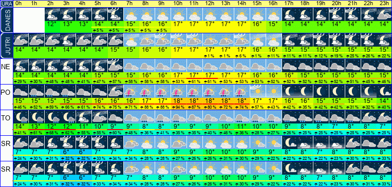 | Ura | 00h | 01h | 02h | 03h | 04h | 05h | 06h | 07h | 08h | 09h | 10h | 11h | 12h | 13h | 14h | 15h | 16h | 17h | 18h | 19h | 20h | 21h | 22h | 23h | |  |  |  |  |  |  |  |  |  |  |  |  |  |  |  |  |  |  |  |  |  |  |  |  | | Temperatura [C°] | 11°C | 12°C | 12°C | 13°C | 13°C | 14°C | 14°C | 15°C | 16°C | 16°C | 17°C | 17°C | 17°C | 17°C | 17°C | 16°C | 15°C | 14°C | 14°C | 14°C | 14°C | 14°C | 14°C | 14°C | | Občutek [C°] | 10°C | 11°C | 11°C | 12°C | 12°C | 13°C | 13°C | 14°C | 15°C | 16°C | 17°C | 17°C | 17°C | 17°C | 16°C | 16°C | 15°C | 14°C | 14°C | 13°C | 13°C | 13°C | 14°C | 13°C | | Možnost padavin | | | | | | 5 % | 5 % | 5 % | 5 % | 5 % | | | | | | | | | | | | | | | | Količina padavin [mm] | | | | | | | | | | | | | | | | | | | | | | | | | Sneg [cm] | | | | | | | | | | | | | | | | | | | | | | | | | | UV index | | | | | | | | | | | UV 1 | UV 1 | UV 2 | UV 2 | UV 1 | UV 1 | | | | | | | | | | Hitrost vetra | 4 km/h | 4 km/h | 5 km/h | 5 km/h | 6 km/h | 6 km/h | 6 km/h | 6 km/h | 6 km/h | 7 km/h | 7 km/h | 7 km/h | 9 km/h | 9 km/h | 9 km/h | 8 km/h | 7 km/h | 6 km/h | 5 km/h | 5 km/h | 6 km/h | 7 km/h | 7 km/h | 8 km/h | Smer vetra | S | S | S | V | V | V | V | V | V | V | J | J | J | J | Z | J | J | J | J | J | J | J | J | J | | Zračni tlak | 1024 | 1023 | 1023 | 1023 | 1022 | 1022 | 1022 | 1022 | 1022 | 1022 | 1022 | 1022 | 1021 | 1020 | 1020 | 1020 | 1020 | 1020 | 1020 | 1020 | 1020 | 1020 | 1019 | 1019 | | Vlaga | 89 % | 88 % | 85 % | 85 % | 84 % | 83 % | 82 % | 78 % | 79 % | 84 % | 82 % | 79 % | 80 % | 84 % | 83 % | 88 % | 92 % | 94 % | 98 % | 95 % | 96 % | 95 % | 99 % | 97 % |