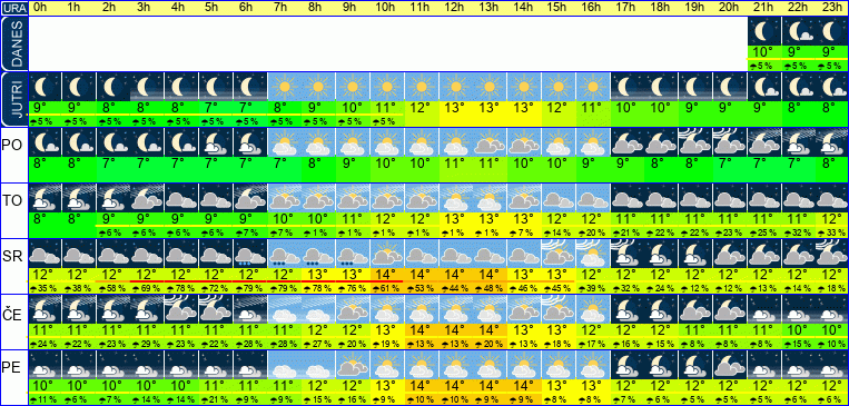 | Ura | 20h | 21h | 22h | 23h | | | | | | | | | | | | | | | | | | | | | |  |  |  |  | | Temperatura [C°] | 10°C | 10°C | 9°C | 9°C | | Občutek [C°] | 8°C | 7°C | 7°C | 7°C | | Možnost padavin | 5 % | 5 % | 5 % | 5 % | | Količina padavin [mm] | | | | | Sneg [cm] | | | | | | UV index | | | | | | Hitrost vetra | 7 km/h | 7 km/h | 7 km/h | 7 km/h | Smer vetra | S | S | S | S | | Zračni tlak | 1026 | 1026 | 1026 | 1026 | | Vlaga | 77 % | 76 % | 76 % | 76 % |