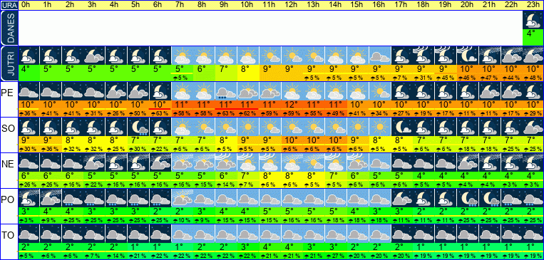 | Ura | 00h | 01h | 02h | 03h | 04h | 05h | 06h | 07h | 08h | 09h | 10h | 11h | 12h | 13h | 14h | 15h | 16h | 17h | 18h | 19h | 20h | 21h | 22h | 23h | |  |  |  |  |  |  |  |  |  |  |  |  |  |  |  |  |  |  |  |  |  |  |  |  | | Temperatura [C°] | 4°C | 4°C | 5°C | 5°C | 5°C | 5°C | 5°C | 5°C | 6°C | 7°C | 8°C | 9°C | 9°C | 9°C | 9°C | 9°C | 9°C | 9°C | 9°C | 9°C | 10°C | 10°C | 10°C | 10°C | | Občutek [C°] | -0°C | 0°C | 0°C | 1°C | 1°C | 1°C | 1°C | 1°C | 2°C | 3°C | 4°C | 5°C | 5°C | 5°C | 5°C | 4°C | 4°C | 4°C | 4°C | 4°C | 4°C | 4°C | 4°C | 4°C | | Možnost padavin | | | | | | 5 % | 5 % | 5 % | 12 % | 5 % | 5 % | 5 % | 5 % | 5 % | 5 % | 12 % | 12 % | 24 % | 37 % | 55 % | 57 % | 54 % | 55 % | 44 % | | Količina padavin [mm] | | | | | | | | | | | | | | | | | | | | | | 1 mm | | | Sneg [cm] | | | | | | | | | | | | | | | | | | | | | | | | | | UV index | | | | | | | | | | | | | UV 1 | UV 1 | UV 1 | UV 1 | | | | | | | | | | Hitrost vetra | 9 km/h | 9 km/h | 10 km/h | 9 km/h | 9 km/h | 9 km/h | 9 km/h | 9 km/h | 9 km/h | 9 km/h | 11 km/h | 13 km/h | 15 km/h | 16 km/h | 16 km/h | 15 km/h | 15 km/h | 16 km/h | 19 km/h | 22 km/h | 24 km/h | 25 km/h | 26 km/h | 27 km/h | Smer vetra | S | S | S | V | S | S | S | V | V | V | J | J | J | Z | J | J | J | J | J | J | J | J | J | J | | Zračni tlak | 1021 | 1021 | 1020 | 1020 | 1020 | 1020 | 1019 | 1019 | 1019 | 1019 | 1019 | 1019 | 1018 | 1017 | 1017 | 1016 | 1016 | 1015 | 1015 | 1014 | 1014 | 1014 | 1013 | 1012 | | Vlaga | 70 % | 70 % | 71 % | 71 % | 71 % | 74 % | 76 % | 75 % | 71 % | 65 % | 58 % | 59 % | 60 % | 61 % | 62 % | 65 % | 67 % | 69 % | 72 % | 72 % | 73 % | 73 % | 73 % | 73 % |