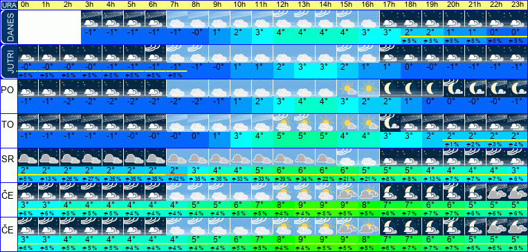 | Temperatura: | -1°C / 1°C / 4°C (+-0°C) | Možnost padavin: | 5 % | Hitrost vetra: | 1 / 2 / 2 km/h (+-1) | Skupna oblačnost: | 61 / 78 / 98 % (+-39) |