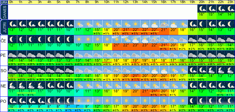 Ura | 00h | 01h | 02h | 03h | 04h | 05h | 06h | 07h | 08h | 09h | 10h | 11h | 12h | 13h | 14h | 15h | 16h | 17h | 18h | 19h | 20h | 21h | 22h | 23h | |  |  |  |  |  |  |  |  |  |  |  |  |  |  |  |  |  |  |  |  |  |  |  |  | Temperatura [C°] | 12°C | 11°C | 11°C | 11°C | 10°C | 10°C | 10°C | 10°C | 12°C | 15°C | 18°C | 21°C | 22°C | 23°C | 23°C | 22°C | 21°C | 20°C | 18°C | 17°C | 16°C | 15°C | 15°C | 14°C | Občutek [C°] | 9°C | 9°C | 9°C | 8°C | 8°C | 7°C | 7°C | 7°C | 9°C | 12°C | 16°C | 19°C | 20°C | 21°C | 21°C | 20°C | 19°C | 18°C | 17°C | 16°C | 16°C | 15°C | 14°C | 14°C | Možnost padavin | | | | | | | | | | | | | | | | | 1 % | 1 % | 2 % | 2 % | 3 % | 30 % | 31 % | 25 % | Količina padavin [mm] | | | | | | | | | | | | | | | | | | | | | | | | | Sneg [cm] | | | | | | | | | | | | | | | | | | | | | | | | | UV index | | | | | | | | | | | UV 1 | UV 2 | UV 3 | UV 3 | UV 3 | UV 3 | UV 2 | UV 1 | | | | | | | Hitrost vetra | 8 km/h | 8 km/h | 7 km/h | 7 km/h | 7 km/h | 7 km/h | 7 km/h | 7 km/h | 7 km/h | 7 km/h | 5 km/h | 3 km/h | 2 km/h | 3 km/h | 4 km/h | 5 km/h | 8 km/h | 8 km/h | 5 km/h | 2 km/h | 2 km/h | 3 km/h | 3 km/h | 3 km/h | Smer vetra | V | V | V | V | S | V | V | S | S | S | S | S | S | Z | J | J | J | J | J | J | V | V | V | V | Zračni tlak | 1019 | 1019 | 1019 | 1019 | 1019 | 1019 | 1019 | 1019 | 1019 | 1019 | 1019 | 1019 | 1018 | 1018 | 1017 | 1017 | 1017 | 1017 | 1017 | 1017 | 1017 | 1017 | 1017 | 1017 | Vlaga | 68 % | 68 % | 65 % | 65 % | 66 % | 65 % | 64 % | 63 % | 57 % | 47 % | 39 % | 34 % | 32 % | 31 % | 32 % | 34 % | 38 % | 44 % | 54 % | 66 % | 75 % | 77 % | 75 % | 75 % |