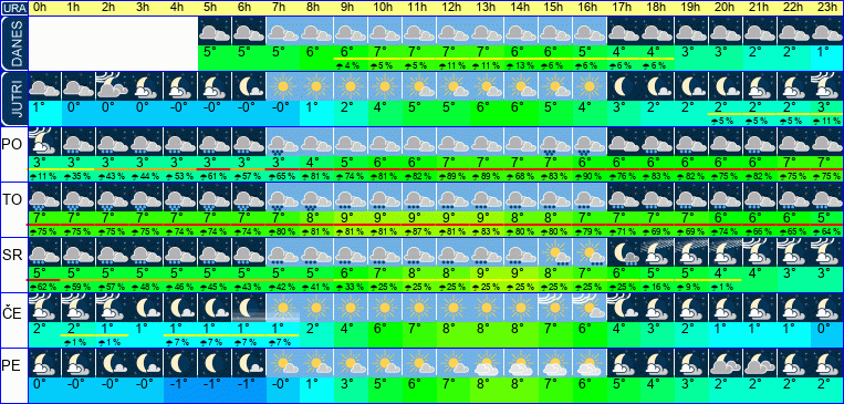 | Ura | 05h | 06h | 07h | 08h | 09h | 10h | 11h | 12h | 13h | 14h | 15h | 16h | 17h | 18h | 19h | 20h | 21h | 22h | 23h | | | | | | |  |  |  |  |  |  |  |  |  |  |  |  |  |  |  |  |  |  |  | | Temperatura [C°] | 5°C | 5°C | 5°C | 6°C | 6°C | 7°C | 7°C | 7°C | 7°C | 6°C | 6°C | 5°C | 4°C | 4°C | 3°C | 3°C | 2°C | 2°C | 1°C | | Občutek [C°] | 1°C | 0°C | 0°C | 1°C | 1°C | 2°C | 2°C | 2°C | 2°C | 2°C | 1°C | 1°C | -0°C | -0°C | -1°C | -1°C | -2°C | -2°C | -3°C | | Možnost padavin | | | | | 4 % | 5 % | 5 % | 11 % | 11 % | 13 % | 6 % | 6 % | 6 % | 6 % | | | | | | | Količina padavin [mm] | | | | | | | | | | | | | | | | | | | | Sneg [cm] | | | | | | | | | | | | | | | | | | | | | UV index | | | | | | | UV 1 | UV 1 | UV 1 | UV 1 | | | | | | | | | | | Hitrost vetra | 10 km/h | 11 km/h | 11 km/h | 11 km/h | 11 km/h | 11 km/h | 10 km/h | 10 km/h | 9 km/h | 8 km/h | 7 km/h | 7 km/h | 6 km/h | 6 km/h | 6 km/h | 6 km/h | 6 km/h | 6 km/h | 6 km/h | Smer vetra | V | V | V | V | V | V | V | V | V | V | V | V | V | V | V | V | V | V | V | | Zračni tlak | 1016 | 1016 | 1017 | 1017 | 1018 | 1018 | 1018 | 1018 | 1018 | 1018 | 1019 | 1019 | 1019 | 1020 | 1020 | 1020 | 1020 | 1021 | 1021 | | Vlaga | 54 % | 54 % | 52 % | 49 % | 45 % | 41 % | 39 % | 39 % | 40 % | 41 % | 45 % | 49 % | 52 % | 53 % | 54 % | 57 % | 58 % | 61 % | 63 % |