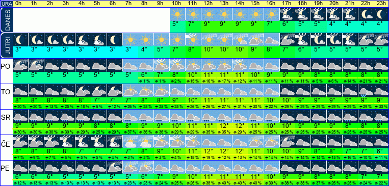| Ura | 00h | 01h | 02h | 03h | 04h | 05h | 06h | 07h | 08h | 09h | 10h | 11h | 12h | 13h | 14h | 15h | 16h | 17h | 18h | 19h | 20h | 21h | 22h | 23h | |  |  |  |  |  |  |  |  |  |  |  |  |  |  |  |  |  |  |  |  |  |  |  |  | | Temperatura [C°] | 5°C | 5°C | 5°C | 5°C | 5°C | 5°C | 5°C | 5°C | 6°C | 7°C | 8°C | 10°C | 11°C | 11°C | 11°C | 10°C | 9°C | 9°C | 9°C | 8°C | 8°C | 8°C | 8°C | 8°C | | Občutek [C°] | 2°C | 2°C | 2°C | 2°C | 2°C | 2°C | 2°C | 2°C | 3°C | 4°C | 6°C | 7°C | 9°C | 9°C | 9°C | 8°C | 7°C | 7°C | 7°C | 6°C | 6°C | 6°C | 6°C | 6°C | | Možnost padavin | | | | | | | | | 1 % | 1 % | 2 % | 15 % | 16 % | 17 % | 12 % | 11 % | 11 % | 11 % | 11 % | 5 % | 6 % | 14 % | 21 % | 21 % | | Količina padavin [mm] | | | | | | | | | | | | | | | | | | | | | | | | | Sneg [cm] | | | | | | | | | | | | | | | | | | | | | | | | | | UV index | | | | | | | | | | | | UV 1 | UV 1 | UV 1 | UV 1 | | | | | | | | | | | Hitrost vetra | 4 km/h | 4 km/h | 4 km/h | 4 km/h | 4 km/h | 4 km/h | 4 km/h | 4 km/h | 4 km/h | 4 km/h | 3 km/h | 3 km/h | 2 km/h | 2 km/h | 2 km/h | 2 km/h | 2 km/h | 3 km/h | 3 km/h | 4 km/h | 4 km/h | 4 km/h | 4 km/h | 4 km/h | Smer vetra | V | V | V | V | V | V | V | V | V | V | V | J | J | J | J | V | V | S | S | V | V | V | V | V | | Zračni tlak | 1019 | 1019 | 1019 | 1019 | 1020 | 1020 | 1020 | 1021 | 1021 | 1022 | 1022 | 1022 | 1022 | 1022 | 1022 | 1022 | 1022 | 1022 | 1022 | 1022 | 1022 | 1022 | 1022 | 1022 | | Vlaga | 62 % | 59 % | 60 % | 60 % | 65 % | 66 % | 68 % | 71 % | 72 % | 69 % | 63 % | 60 % | 60 % | 59 % | 58 % | 61 % | 68 % | 71 % | 74 % | 74 % | 75 % | 76 % | 74 % | 76 % |