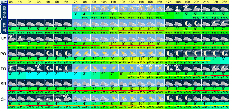 | Ura | 00h | 01h | 02h | 03h | 04h | 05h | 06h | 07h | 08h | 09h | 10h | 11h | 12h | 13h | 14h | 15h | 16h | 17h | 18h | 19h | 20h | 21h | 22h | 23h | |  |  |  |  |  |  |  |  |  |  |  |  |  |  |  |  |  |  |  |  |  |  |  |  | | Temperatura [C°] | 3°C | 3°C | 2°C | 2°C | 2°C | 2°C | 2°C | 2°C | 3°C | 4°C | 6°C | 7°C | 9°C | 9°C | 10°C | 9°C | 8°C | 7°C | 7°C | 6°C | 6°C | 5°C | 5°C | 5°C | | Občutek [C°] | 0°C | -0°C | -0°C | -0°C | -1°C | -1°C | -1°C | -1°C | 0°C | 2°C | 3°C | 5°C | 6°C | 7°C | 7°C | 7°C | 6°C | 5°C | 5°C | 4°C | 4°C | 3°C | 3°C | 3°C | | Možnost padavin | | | | | | | | | | | | | | 7 % | 8 % | 9 % | 10 % | 19 % | 35 % | 37 % | 47 % | 57 % | 60 % | 71 % | | Količina padavin [mm] | | | | | | | | | | | | | | | | | | | | | | | | | Sneg [cm] | | | | | | | | | | | | | | | | | | | | | | | | | | UV index | | | | | | | | | | | | UV 1 | UV 1 | UV 1 | UV 1 | | | | | | | | | | | Hitrost vetra | 3 km/h | 3 km/h | 3 km/h | 3 km/h | 3 km/h | 3 km/h | 4 km/h | 4 km/h | 3 km/h | 3 km/h | 3 km/h | 3 km/h | 3 km/h | 3 km/h | 3 km/h | 3 km/h | 3 km/h | 2 km/h | 2 km/h | 2 km/h | 2 km/h | 3 km/h | 4 km/h | 4 km/h | Smer vetra | V | V | V | V | V | V | V | V | V | V | V | V | J | J | J | Z | Z | J | V | V | V | V | V | V | | Zračni tlak | 1003 | 1003 | 1003 | 1004 | 1004 | 1004 | 1004 | 1004 | 1004 | 1004 | 1004 | 1004 | 1004 | 1003 | 1003 | 1003 | 1002 | 1002 | 1002 | 1002 | 1001 | 1001 | 1001 | 1000 | | Vlaga | 87 % | 87 % | 87 % | 87 % | 87 % | 88 % | 88 % | 88 % | 86 % | 83 % | 79 % | 73 % | 68 % | 65 % | 66 % | 68 % | 72 % | 76 % | 79 % | 83 % | 84 % | 85 % | 85 % | 86 % |