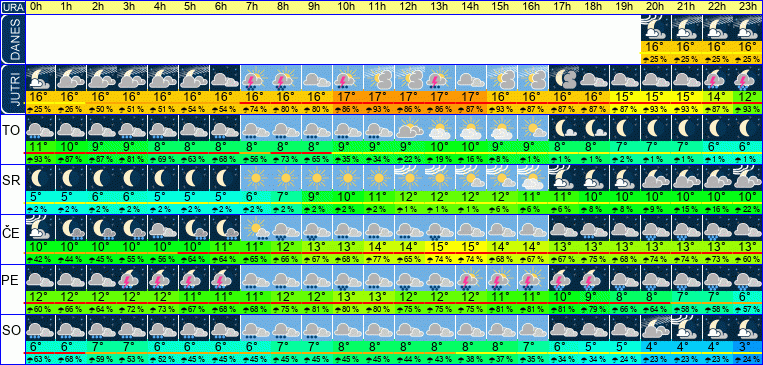 | Ura | 00h | 01h | 02h | 03h | 04h | 05h | 06h | 07h | 08h | 09h | 10h | 11h | 12h | 13h | 14h | 15h | 16h | 17h | 18h | 19h | 20h | 21h | 22h | 23h | |  |  |  |  |  |  |  |  |  |  |  |  |  |  |  |  |  |  |  |  |  |  |  |  | | Temperatura [C°] | 16°C | 16°C | 16°C | 16°C | 16°C | 16°C | 16°C | 16°C | 16°C | 16°C | 17°C | 17°C | 17°C | 17°C | 17°C | 16°C | 16°C | 16°C | 16°C | 15°C | 15°C | 15°C | 14°C | 12°C | | Občutek [C°] | 12°C | 12°C | 12°C | 12°C | 12°C | 12°C | 11°C | 12°C | 12°C | 13°C | 13°C | 15°C | 14°C | 14°C | 15°C | 16°C | 16°C | 16°C | 16°C | 15°C | 15°C | 14°C | 13°C | 10°C | | Možnost padavin | 25 % | 26 % | 50 % | 51 % | 51 % | 54 % | 54 % | 74 % | 80 % | 80 % | 86 % | 93 % | 86 % | 86 % | 87 % | 93 % | 87 % | 87 % | 87 % | 87 % | 93 % | 93 % | 87 % | 93 % | | Količina padavin [mm] | | | | | | | | 5 mm | 4 mm | | 1 mm | | | | | | | | | | | | | 3 mm | Sneg [cm] | | | | | | | | | | | | | | | | | | | | | | | | | | UV index | | | | | | | | | | | | | UV 1 | UV 1 | UV 1 | | | | | | | | | | | Hitrost vetra | 22 km/h | 20 km/h | 20 km/h | 20 km/h | 20 km/h | 21 km/h | 27 km/h | 24 km/h | 25 km/h | 24 km/h | 24 km/h | 15 km/h | 16 km/h | 18 km/h | 15 km/h | 6 km/h | 3 km/h | 2 km/h | 3 km/h | 5 km/h | 8 km/h | 7 km/h | 10 km/h | 9 km/h | Smer vetra | J | J | J | J | J | J | J | J | J | J | J | J | J | Z | Z | Z | J | J | V | V | V | V | V | V | | Zračni tlak | 1009 | 1009 | 1008 | 1007 | 1006 | 1005 | 1005 | 1004 | 1004 | 1004 | 1004 | 1004 | 1004 | 1004 | 1004 | 1004 | 1004 | 1005 | 1006 | 1006 | 1007 | 1008 | 1009 | 1010 | | Vlaga | 72 % | 75 % | 76 % | 78 % | 79 % | 81 % | 82 % | 82 % | 82 % | 82 % | 79 % | 77 % | 70 % | 72 % | 75 % | 81 % | 82 % | 84 % | 81 % | 83 % | 88 % | 88 % | 88 % | 86 % |