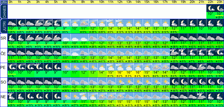 | Ura | 00h | 01h | 02h | 03h | 04h | 05h | 06h | 07h | 08h | 09h | 10h | 11h | 12h | 13h | 14h | 15h | 16h | 17h | 18h | 19h | 20h | 21h | 22h | 23h | |  |  |  |  |  |  |  |  |  |  |  |  |  |  |  |  |  |  |  |  |  |  |  |  | | Temperatura [C°] | 10°C | 10°C | 9°C | 9°C | 9°C | 9°C | 9°C | 10°C | 11°C | 12°C | 13°C | 14°C | 14°C | 14°C | 14°C | 14°C | 13°C | 13°C | 12°C | 11°C | 11°C | 10°C | 10°C | 10°C | | Občutek [C°] | 8°C | 8°C | 8°C | 7°C | 7°C | 7°C | 8°C | 9°C | 10°C | 11°C | 12°C | 12°C | 12°C | 12°C | 12°C | 12°C | 11°C | 11°C | 10°C | 10°C | 9°C | 9°C | 9°C | 8°C | | Možnost padavin | 25 % | 25 % | 25 % | 25 % | 25 % | | | | | | 5 % | | 5 % | 6 % | 25 % | 25 % | 13 % | 11 % | | | | | | 1 % | | Količina padavin [mm] | | | | | | | | | | | | | | | | | | | | | | | | | Sneg [cm] | | | | | | | | | | | | | | | | | | | | | | | | | | UV index | | | | | | | | | | | UV 1 | UV 1 | UV 2 | UV 2 | UV 2 | UV 1 | UV 1 | | | | | | | | | Hitrost vetra | 4 km/h | 4 km/h | 4 km/h | 4 km/h | 4 km/h | 4 km/h | 4 km/h | 4 km/h | 3 km/h | 3 km/h | 3 km/h | 5 km/h | 6 km/h | 7 km/h | 6 km/h | 6 km/h | 5 km/h | 4 km/h | 3 km/h | 3 km/h | 3 km/h | 3 km/h | 3 km/h | 3 km/h | Smer vetra | V | S | S | S | S | S | S | S | S | Z | Z | J | J | J | J | J | J | J | V | S | S | S | S | S | | Zračni tlak | 1026 | 1026 | 1026 | 1025 | 1025 | 1025 | 1025 | 1025 | 1025 | 1025 | 1025 | 1025 | 1025 | 1024 | 1024 | 1024 | 1023 | 1024 | 1024 | 1024 | 1024 | 1025 | 1025 | 1025 | | Vlaga | 74 % | 79 % | 82 % | 85 % | 86 % | 82 % | 82 % | 82 % | 80 % | 76 % | 70 % | 63 % | 58 % | 59 % | 58 % | 57 % | 62 % | 67 % | 69 % | 71 % | 73 % | 75 % | 78 % | 76 % |