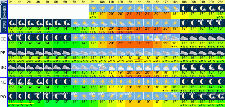 Ura | 00h | 01h | 02h | 03h | 04h | 05h | 06h | 07h | 08h | 09h | 10h | 11h | 12h | 13h | 14h | 15h | 16h | 17h | 18h | 19h | 20h | 21h | 22h | 23h | |  |  |  |  |  |  |  |  |  |  |  |  |  |  |  |  |  |  |  |  |  |  |  |  | Temperatura [C°] | 15°C | 14°C | 14°C | 14°C | 14°C | 13°C | 13°C | 13°C | 14°C | 17°C | 19°C | 20°C | 21°C | 21°C | 21°C | 21°C | 20°C | 19°C | 18°C | 17°C | 17°C | 17°C | 16°C | 16°C | Občutek [C°] | 12°C | 11°C | 11°C | 11°C | 11°C | 10°C | 10°C | 10°C | 11°C | 14°C | 16°C | 18°C | 19°C | 19°C | 19°C | 19°C | 18°C | 17°C | 17°C | 16°C | 16°C | 17°C | 17°C | 16°C | Možnost padavin | | | | | | | | | | | | | | | | | | | 7 % | 13 % | 14 % | 14 % | 15 % | 16 % | Količina padavin [mm] | | | | | | | | | | | | | | | | | | | | | | | | | Sneg [cm] | | | | | | | | | | | | | | | | | | | | | | | | | UV index | | | | | | | | | | | UV 1 | UV 2 | UV 3 | UV 3 | UV 3 | UV 2 | UV 1 | UV 1 | | | | | | | Hitrost vetra | 8 km/h | 8 km/h | 8 km/h | 7 km/h | 8 km/h | 8 km/h | 8 km/h | 8 km/h | 8 km/h | 8 km/h | 9 km/h | 6 km/h | 5 km/h | 6 km/h | 7 km/h | 6 km/h | 7 km/h | 8 km/h | 6 km/h | 4 km/h | 2 km/h | 1 km/h | 1 km/h | 1 km/h | Smer vetra | V | S | S | V | V | V | V | V | S | V | V | V | V | V | V | V | V | V | V | V | V | S | S | S | Zračni tlak | 1019 | 1019 | 1019 | 1019 | 1019 | 1018 | 1018 | 1018 | 1019 | 1019 | 1019 | 1019 | 1018 | 1018 | 1017 | 1017 | 1017 | 1017 | 1017 | 1017 | 1017 | 1017 | 1017 | 1017 | Vlaga | 48 % | 49 % | 50 % | 51 % | 52 % | 52 % | 53 % | 54 % | 52 % | 45 % | 40 % | 37 % | 38 % | 38 % | 39 % | 42 % | 44 % | 49 % | 56 % | 62 % | 67 % | 69 % | 71 % | 73 % |