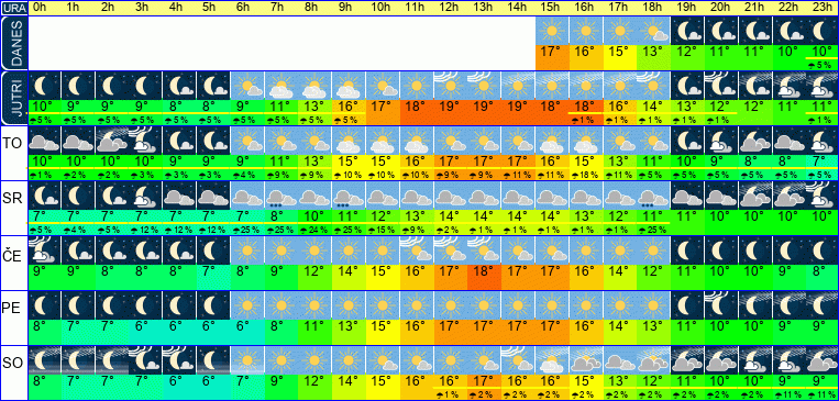 | Ura | 00h | 01h | 02h | 03h | 04h | 05h | 06h | 07h | 08h | 09h | 10h | 11h | 12h | 13h | 14h | 15h | 16h | 17h | 18h | 19h | 20h | 21h | 22h | 23h | |  |  |  |  |  |  |  |  |  |  |  |  |  |  |  |  |  |  |  |  |  |  |  |  | | Temperatura [C°] | 10°C | 10°C | 10°C | 10°C | 9°C | 9°C | 10°C | 12°C | 13°C | 15°C | 15°C | 16°C | 17°C | 17°C | 17°C | 16°C | 15°C | 13°C | 11°C | 10°C | 9°C | 8°C | 8°C | 7°C | | Občutek [C°] | 7°C | 7°C | 6°C | 6°C | 5°C | 5°C | 5°C | 7°C | 9°C | 10°C | 10°C | 11°C | 12°C | 12°C | 12°C | 11°C | 9°C | 8°C | 6°C | 5°C | 4°C | 3°C | 2°C | 2°C | | Možnost padavin | 1 % | 2 % | 2 % | 3 % | 3 % | 3 % | 4 % | 9 % | 10 % | 10 % | 10 % | 10 % | 10 % | 9 % | 11 % | 11 % | 18 % | 11 % | 5 % | 6 % | 6 % | 5 % | 5 % | 5 % | | Količina padavin [mm] | | | | | | | | | | | | | | | | | | | | | | | | | Sneg [cm] | | | | | | | | | | | | | | | | | | | | | | | | | | UV index | | | | | | | | | | UV 1 | UV 1 | UV 2 | UV 3 | UV 3 | UV 3 | UV 2 | UV 1 | UV 1 | | | | | | | | Hitrost vetra | 7 km/h | 7 km/h | 8 km/h | 8 km/h | 9 km/h | 10 km/h | 10 km/h | 11 km/h | 13 km/h | 14 km/h | 15 km/h | 16 km/h | 16 km/h | 16 km/h | 16 km/h | 16 km/h | 16 km/h | 17 km/h | 16 km/h | 16 km/h | 16 km/h | 17 km/h | 16 km/h | 16 km/h | Smer vetra | S | V | V | S | S | S | V | V | S | V | V | V | V | S | S | S | S | S | S | V | S | S | S | S | | Zračni tlak | 1016 | 1016 | 1015 | 1015 | 1015 | 1015 | 1016 | 1016 | 1016 | 1016 | 1016 | 1016 | 1016 | 1015 | 1015 | 1015 | 1014 | 1015 | 1015 | 1016 | 1016 | 1016 | 1016 | 1016 | | Vlaga | 59 % | 54 % | 50 % | 46 % | 44 % | 44 % | 45 % | 42 % | 38 % | 36 % | 35 % | 35 % | 35 % | 35 % | 34 % | 34 % | 35 % | 38 % | 44 % | 49 % | 51 % | 50 % | 50 % | 50 % |
